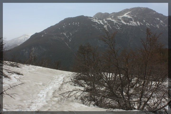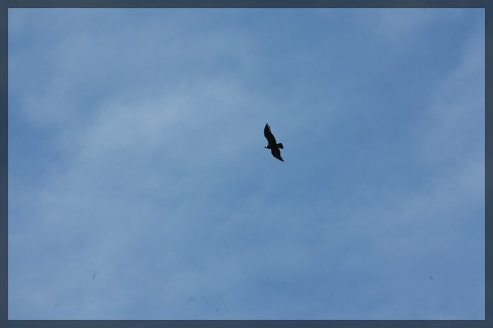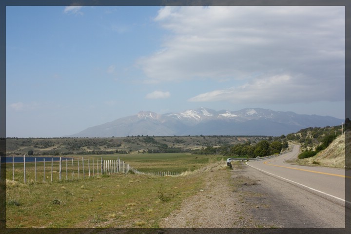 Blick über den Lago Menendez auf den Cerro Torrecillas.Wir fahren weiter entlang des Ufers vom Lago Futalaufquen nach Süden. nach Villa Futalaufquen, wo sich die Verwaltung des Nationalparks befindet. Wie schon im bisherigen Verlauf unserer Reise stellen wir auch hier fest, dass wir deutlich vor der Saison unterwegs sind: Die Ortschaft ist absolut verlassen und im kleinen Visitor Center des Nationalparks sind wir - mit Ausnahme des Rangers hinter dem Tresen - alleine. Am südlichen Parkausgang befindet sich eine größere Straßenbaustelle. Es sieht so aus, als würde auch hier bald ein größerer Teil der Straße asphaltiert sein. Außerhalb des Parks finden wir uns in einer grandiosen Landschaft wieder: Die Straße führt durch eine endlos weite Landschaft, umschlossen von hohen Bergen. Wir halten an, um den Ausblick zu genießen und um Fotos zu machen. Dabei finden wir, majestätisch Kreise im Himmel ziehend, den ersten Kondor unserer Reise - gut zu erkennen am riesigen schwarzen Körper mit einer weißen Halskrause. Das ist wirklich Patagonien, wie man es sich vorstellt.