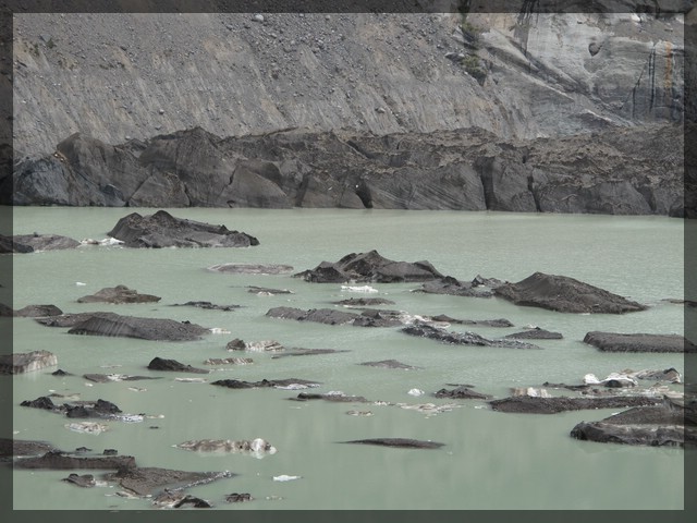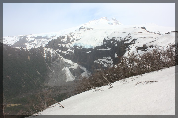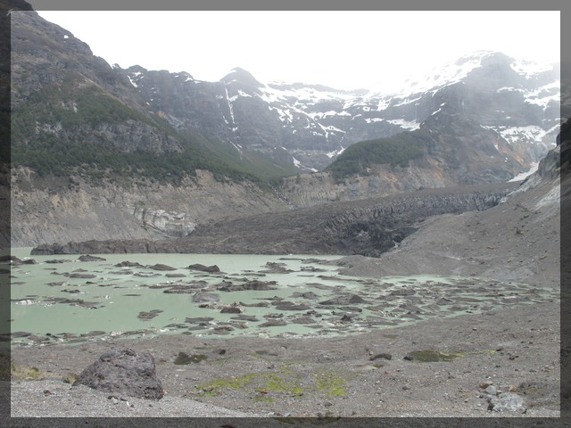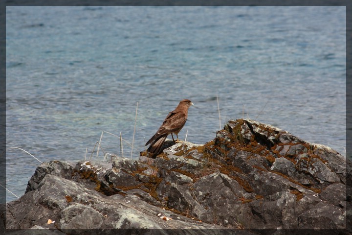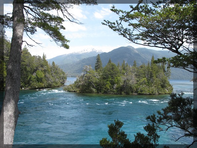 Ausfluss des Rio Menendez aus dem Lago Menendez.An der östlichsten Stelle der Halbinsel kommen wir zu der kleinen Schiffsanlegestelle. Hier starten zur Hochsaison die Bootsfahrten, die über den Lago Menendez zu den letzten Reservaten führen, an denen es noch größere Mengen wirklich alter Alercen gibt. Heute dagegen sind wir alleine hier, mit der Ausnahme eines kleinen Raubvogels, der es sich auf einen großen Felsbrocken im Wasser gemütlich gemacht hat und uns interessiert beäugt. Direkt neben der Anlegestelle befindet sich ein Strand, von dem aus sich der Lago Menendez in seiner gesamten Länge überblicken lässt. Dahinter steht der 2253 Meter hohe Cerro Torrecillas, von dem aus ein beeindruckender Gletscher Richtung See fließt. Unser Weg führt uns weiter um die Halbinsel herum, vorbei am Lago Verde. Hier sehen wir besonders viele rot blühende Notro-Bäume sowie gelben Ginster. Eine nette Wanderung, für die wir mit vielen Pausen etwa eineinhalb Stunden benötigt haben.