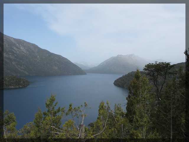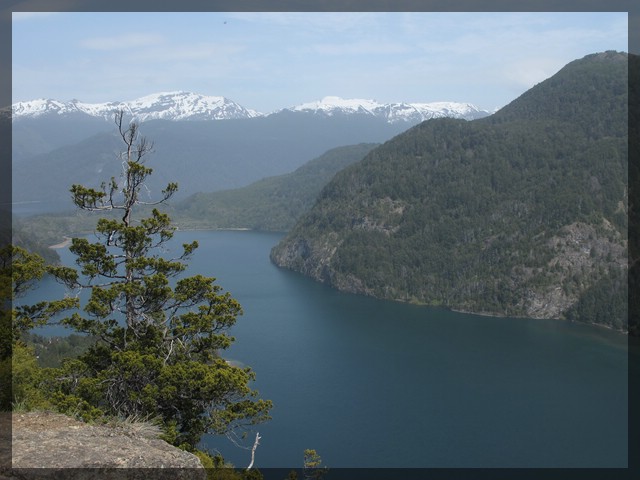Blick auf den Lago Verde.Wir fahren ein kurzes Stück weiter zum Wanderweg Pasarella Rio Arayanes. Als wir unseren Pick Up auf dem Parkplatz verstauen, sehen wir zu unserer Überraschung das Expeditionsmobil aus Ansbach, welches wir schon vor drei Tagen an der Nordseite des Lago Lago Nahuel Huapi gesehen haben. Nachdem damals auf dem Parkplatz recht viel los war und wir daher keine Gelegenheit hatten, uns mit den Fahrern des Gefährts zu unterhalten, sieht die Situation nun ganz anders aus. Da der Parkplatz mit der Ausnahme unseres Autos und des Expeditionsmobils komplett leer ist, begrüßen wir einfach die ersten Wanderer, die uns entgegen kommen, mit einem breiten "Grüß Gott". Das sorgt für Überraschung... Unsere Wanderung führt uns zunächst ein kurzes Stück bergab ins Tal. Hier überqueren wir auf einer lustig schwankenden Hängebrücke den Rio Arayanes und erreichen dann eine Halbinsel, die von Lago Verde, dem Rio Arayanes, dem Rio Menendez, dem Lago Menendez und im Norden dem Cerro Alto el Petiso umschlossen wird. Mit der Besteigung dieses 1748 Meter hohen Bergs hatten wir ursprünglich auch spekuliert. Aufgrund der noch im Gipfelbereich vorhandenen Schneemengen und der heute Früh wegen unserem Hinterreifen verlorenen Zeit verzichten wir aber auf einen Gipfelsturm und nehmen uns daher etwas mehr Zeit, uns im Tal umzuschauen. Hinter der Hängebrücke über den Rio Arayanes treffen wir eine lustig musizierende und vespernde Gruppe von Einheimischen. Der Weg führt weiter entlang des Rio Menendez nach Westen. Der Fluss ist recht wild, wir kommen an heftigen Stromschnellen vorbei. Besonders beeindruckt uns die intensiv türkisgrüne Farbe des Wassers. Hier stehen alle paar Meter Schautafeln, die die Flora und Fauna des Nationalparks erklären. Alles zwar nur auf Spanisch, aber dank vor allem Katharinas Sprachkenntnissen verstehen wir das meiste, was dort erklärt wird. So kommen wir an einigen jungen Alercen vorbei. Zwar noch vergleichsweise kleine, aber trotzdem sehr beeindruckende Bäume.