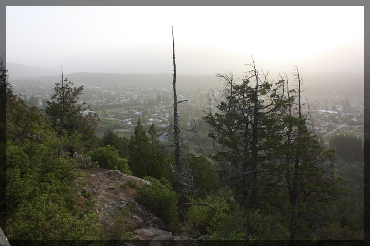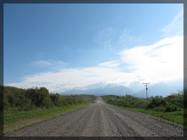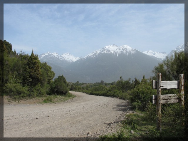 Nach 25 Kilometern in Richtung Süden kommen wir nach Trevelin. Diese Ortschaft ist deutlich kleiner und auch hübscher als Esquel. Beide Ortschaften wurden ursprünglich von walisischen Siedlern gegründet. Neben den Ortsnamen lässt sich dieses Erbe an der einen oder andern Stelle an der Architektur erkennen. So ist etwas Trevelin bekannt für seine irischen Teehäuser. Wir halten uns aber nicht lange auf, sondern fahren weiter nach Süden. Kurz hinter dem Ortsausgang knickt die Ruta 259 nach rechts ab und führt wieder direkt in Richtung der im Westen stehenden Andenkette und der chilenischen Grenze. Die Ruta 259 ist eine schöne Schotterpiste, links und rechts sehen wir wieder viele blühende Lupinen. Ganz entfernt fühlen wir uns an das berühmte Plakat aus der Patagonia-Werbekampagne erinnert - auch wenn wir wissen, dass sich das Motiv für dieses Plakat viel weiter südlich befindet. So oder so macht das Fahren richtig Spaß. Was diesen Spaß allenfalls ein wenig trübt, sind die dicken dunklen Wolken, die offensichtlich auf chilenischer Seite an den Anden hängen und leicht über die Berggipfel hinweglugen. Das sind nicht gerade gute Wetterboten für die kommenden Tage unserer Reise. Naja, mal schauen, wie es kommt.
