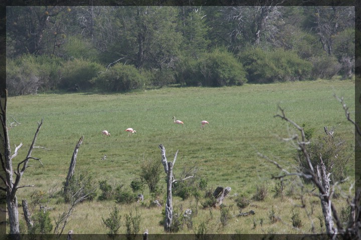 Flamingos.Als ersten Trail im Nationalpark laufen wir den nur knapp 200 Meter kurzen Rundweg zum Aussichtspunkt über den Lago Verde. Waren wir am Lago Rivadavia noch fast auf identischer Höhe mit dem Wasserspiegel, hat die Straße bis hierher deutlich an Höhe gewonnen. Als Folge befinden wir uns etwa 200 Meter oberhalb des Sees und haben daher vom Aussichtspunkt aus einen tollen Blick auf das tiefblaue Wasser - rundherum umgeben von Bergen. Auf dem Trail schauen wir uns auch nach Tieren um. Hier soll es sowohl den seltenen Andenhirsch Huemul geben als auch Pudus. Das sind Zwerghirsche, die kaum größer als Hasen werden. Für Tierbeobachtungen sind wir aber wohl zur falschen Tageszeit unterwegs. Allerdings finden wir ein an einem Ast hängendes Fellbüschel, welches in der Tat ganz offensichtlich von einem Huemul stammt.