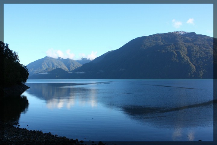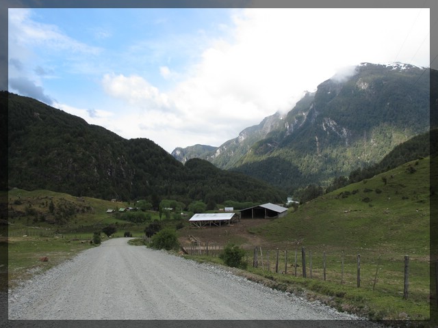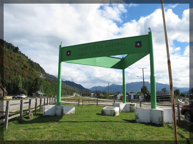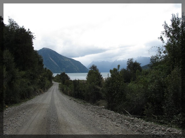 Der Rio Futaleufu.Wir sehen viele Tiere auf und neben der Straße: Pferde, Kühe und Schafe mit sehr jungen Lämmern. Zudem hätten wir auch die Gelegenheit gehabt, ein Huhn zu überfahren. Alle paar Kilometer sehen wir rechts und links neben der Straße Baustellenfahrzeuge und sind uns nicht sicher, ob die Straße nur ausgebessert werden soll oder auch hier tatsächlich an Asphaltierung gedacht wird. Knapp 60 Kilometer hinter Futaleufu erreichen wir zu ersten Mal das Ufer des Lago Yelcho, mit einer Oberfläche von 116 Quadratkilometern einer der größten Seen hier in der Gegend. Die tief an den Bergen hängenden Wolken über dem grauen Wasser des Sees schaffen eine düstere und verwunschene Stimmung. Nach weiteren 14 Kilometern kommen wir nach Villa Santa Lucia und erreichen hier die legendäre Carretera Austral. Diese Straße führt über 1350 Kilometer von Puerto Montt nach Villa O'Higgins. Der Bau der Straße wurde erst 1976 vom Diktator Auguste Pinochet angeordnet - vorher hielt man es wohl schlicht nicht für möglich, eine Straße durch die wilde Berg- und Fjordlandschaft des südlichen Chile zu bauen. Damals konnten zahlreiche chilenische Ortschaften südlich von Puerto Montt nur per Schiff, Flugzeug oder von der argentinischen Seite aus erreicht werden. Über weite Strecken handelt es sich bei der Carretera Austral um eine durch dichten Regenwald führende wilde Schotterpiste. An vielen Stellen, vor allem direkt südlich von Puerto Montt, war es nicht möglich, eine Straße entlang der steilen Fjordtäler zu bauen oder die Fjorde mit Brücken zu überqueren. Hier bilden Fähren einen essentiellen Bestandteil der Straße.