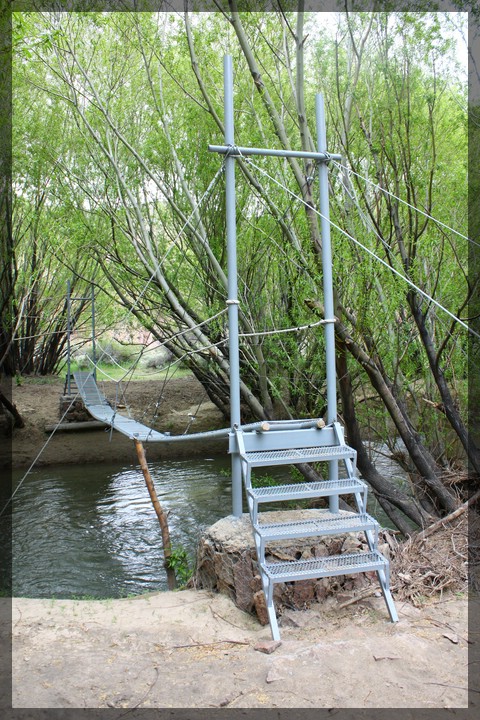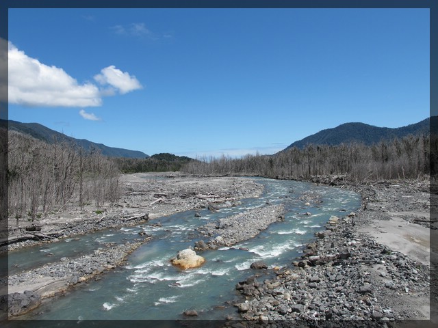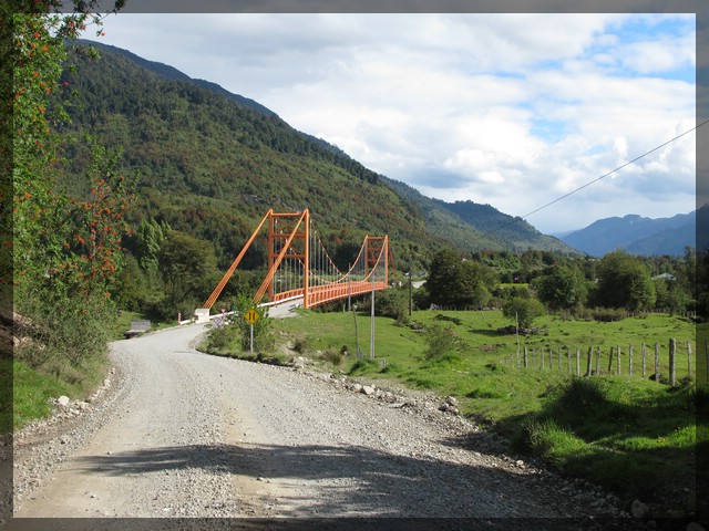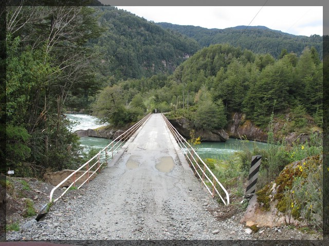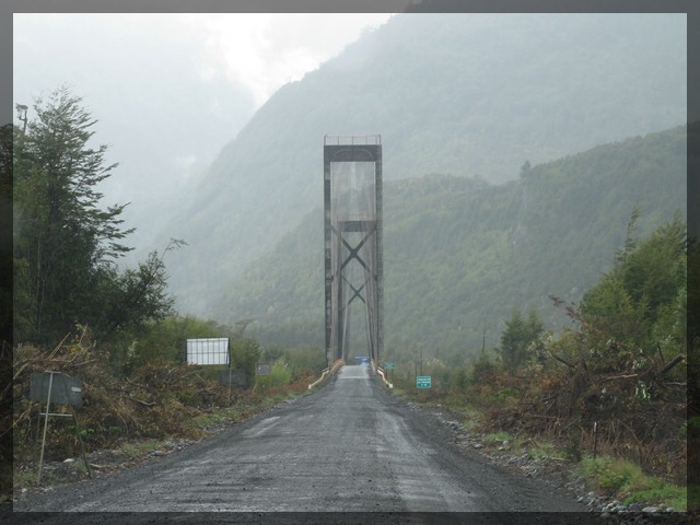Hängebrücke am Nordufer des Lago Yelcho.Nachdem auch der Flughafen der Stadt dem Vulkanausbruch zum Opfer fiel, wurde einige Kilometer nördlich ein Behelfsflughafen errichtet. Die Landebahn dieses Flughafens verläuft direkt neben unserer Straße, Landebahn und Straße bilden quasi eine Einheit. An beiden Seiten des Flughafens gibt es eine große Schranke mit Stoppschild. Hier wird (hoffentlich) abgesperrt, bevor ein Flugzeug starten oder landen will. Ein paar Kilometer später überqueren wir den Rio Blanco, über dessen Flussbett 2008 ein gewisser Teil des Vulkanschlamms abfloss. Die Schwemmflächen links und rechts des Flusses sind äußerst breit, über und über mit Asche bzw. Schlamm bedeckt. Umgeben ist das Ganze von jeder Menge toter Bäume.