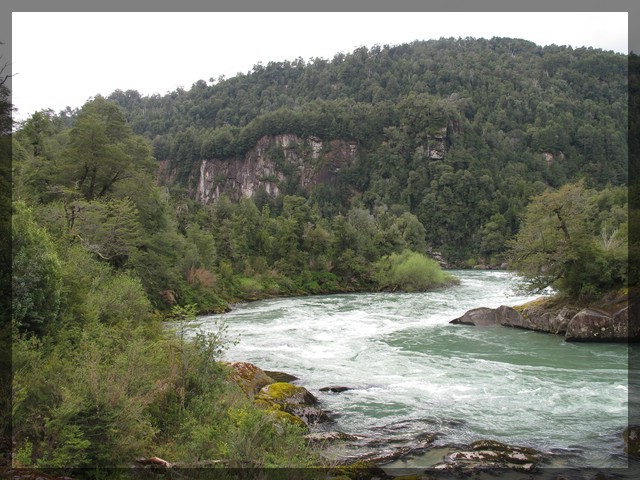 2.11.2011: Futaleufu - Caleta GonzaloNach einem sehr leckeren Frühstück verabschieden wir uns sowohl vom Wirts-Ehepaar als auch von den beiden Berlinern. Wie gestern schon von der argentinischen Seite der Anden aus befürchtet, hat uns das gute Wetter verlassen. Der Himmel ist bedeckt, aber immerhin regnet es nicht. Die Straße ist noch für ein kurzes Stück asphaltiert, dann hat uns der Schotter wieder. Die Straße führt hier durch ein enges Gebirgstal, zunächst bergauf bis zum Lago Loncon. Dies ist der höchste Punkt unserer heutigen Etappe. Von hier an geht es bergab und ab 14 Kilometern nach dem See wird die Straße begleitet vom Rio Futaleufu. Dieser fröhlich über Stromschnellen hüpfende Fluss ist bei Wildwasserfahrern äußerst beliebt. Auch wenn wir zu früh im Jahr unterwegs sind, um solche Sportler zu sehen, läst der Blick auf das brodelnde und wirbelnde Wasser erahnen, wie herausfordernd es ist, sich mit einem Kanu hier über Wasser zu halten. Es ist deutlich zu erkennen, dass die Westseite der Anden wesentlich mehr Wasser abbekommt als die argentinische Seite östlich der Berge. In Argentinien waren wir in tieferen Lagen in einer trockenen Grasebene unterwegs, in den Bergen fuhren wir durch eine relativ trocken anmutende Waldgegend. Hier in Chile hat sich der Charakter des Waldes aber komplett verändert: Viel dichter und feuchter kann man ihn fast schon als Regenwald oder Urwald beschreiben.