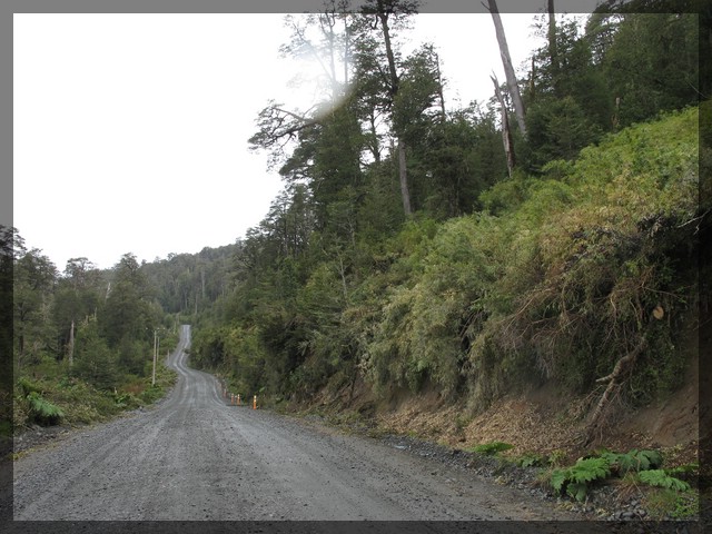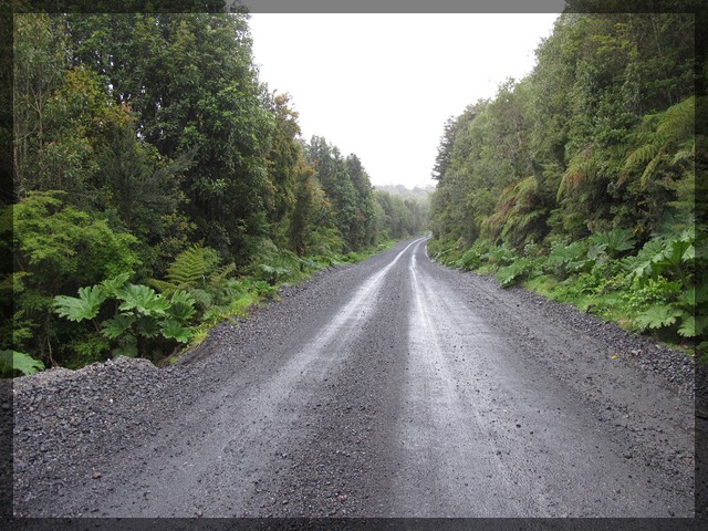 Regennasse Carretera Austral.Unser heutiges Tagesziel ist der etwa 40 Kilometer nördlich von Chaiten gelegene Parque Pumalin. Dieser Naturpark befindet sich im privaten Besitz. Eigentümer ist der amerikanische Millionär Douglas Tompkins, Gründer der Bekleidungsfirmen "The North Face" und "Esprit". 1990 verkaufte er die Anteile an seinen Firmen und verwendet seitdem sein Geld, um in Patagonien große Landflächen aufzukaufen und unter Schutz zu stellen. Der Parque Pumalin umfasst inzwischen eine Fläche von 325000 Hektar, dabei handelt es sich hauptsächlich um Regenwald. Dieser wird somit vor dem Schicksal bewahrt, den weite Flächen des Regenwalds entlang des südlichen Teils der Carretera Austral erleiden mussten: Hier wurde gnadenlos abgeholzt, um Viehwirtschaft zu betreiben. Anfangs noch belächelt, sieht sich Tompkins inzwischen einer wachsenden Gegnerschaft gegenüber, vor allem gebildet von Unternehmern, die den Regenwald ausbeuten wollen. Aber immerhin erklärte Chile im Jahr 2006 den privaten Parque Pumalin offiziell zum Schutzgebiet.