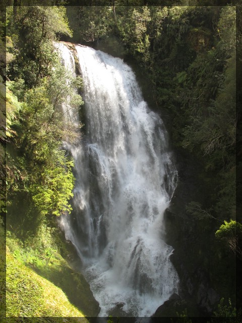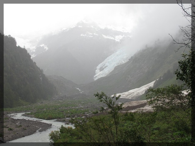 Unterwegs auf der Carretera Austral.Nach etwa 19 Kilometern öffnet sich auf linker Seite das langgezogene Tal in dessen Ende der Ventisquero Yelcho fließt, der Yelcho-Gletscher. Diesen Gletscher kann man über eine etwa viereinhalb Kilometer lange Wanderung erreichen. Nachdem sich die Menge des momentan vom Himmel fallenden Wassers sehr in Grenzen hält und auch die Wolken so weit aufgerissen sind, dass wir den Gletscher schon von der Straße aus sehen können, entscheiden wir uns, einen Versuch zu unternehmen. Also das Auto abgestellt und los geht es, durch den dichten Wald, immer in direkter Nähe des vom Gletscherwasser gespeisten Flusses. Allerdings ist der Weg nicht sonderlich gepflegt, insbesondere in der zweiten Hälfte der Strecke. Es geht damit los, dass von rechts und links große Äste in den Weg hängen und endet damit, dass wir weite Strecken dicht gebückt zurücklegen müssen, um überhaupt durchzukommen. Im Prinzip ein großer Spaß. Aber nicht, wenn das Unterholz, durch das man sich schlägt tropfnass ist und man somit eine kostenlose Dusche von oben erhält. Zudem nimmt auch die Stärke des Regens im Laufe der Zeit wieder deutlich zu, so dass auch die Schlammpfützen auf dem Weg deutlich größer und teilweise sogar richtig unangenehm zu überqueren werden. Zum Glück haben wir halbwegs vernünftige Wanderausrüstung dabei. Zum Beispiel die robusten und alpenerprobten Wanderschuhe helfen schon sehr. Leider liegen gerade unsere nun dringend nötigen Regencapes im Auto... Wasser von oben, unten, links und rechts. Das Wort "Regenwald" beinhaltet ja einen Bestandteil, der Wasser von oben nicht unbedingt ausschließt, aber irgendwann wird es unangenehm. Allerdings wollen wir auch nicht aufgeben und erreichen somit nach 75 Minuten einen breiten Talkessel, an dem sich der Wald öffnet und den Blick auf den noch etwa 1,5 Kilometer entfernten sehr schönen Gletscher frei gibt. Wir könnten von hier aus auch noch über Geröll bis zum Gletscher weiter gehen, darauf verzichten wir aber in Anbetracht der äußeren Umstände. Auf dem Rückweg ist alles noch nasser und der Weg hat sich teilweise in einen kleinen Bach verwandelt. Letztendlich erreichen wir glücklich wieder den Parkplatz mit unserem Auto, wo es fast gar nicht mehr regnet.