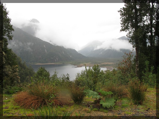 Der Lago Nero.Der Regen und die tief hängenden Wolken sorgen auch hier für eine ganz besondere Stimmung, so dass uns die Fahrt sehr gut gefällt. Im Parque Pumalin gibt es einige schöne Wanderungen. Diese müssen wir aufgrund des inzwischen wieder prasselnden Regens leider auslassen. Wir fahren durch bis Caleta Gonzalo, dem nördlichsten Ende dieses Abschnitts der Carretera Austral. Weiter in Richtung Hornopiren und damit auch in Richtung Puerto Montt geht es nur mit der Fähre. Es gibt zwar Pläne, eine Straße durch den Parque Pumalin entlang des Fjordufers zu bauen. Allerdings setzt sich Douglas Tompkins energisch gegen diese Pläne zur Wehr. Mal schauen, ob bzw. wie lange er es schafft, sich durchzusetzen. Caleta Gonzalo liegt am der Seite eines Fjordes und besteht aus einem Fähranleger, einem Gebäude der Parkverwaltung sowie einer Lodge. Da es in dieser Lodge nur relativ wenige Cabins gibt, waren wir während der Reisevorbereitung froh, hier noch buchen zu können. Letztendlich verdeutlicht es sich zum wiederholten Male, dass wir nicht zur Hauptsaison unterwegs sind: Wir sind die einzigen Gäste. Nachdem wir in unserer Cabin unsere nassen Klamotten zum Trockenen aufgehängt haben, bekommen wir im Hauptgebäude der Lodge das Abendessen serviert: von zwei Leuten, die ganz alleine für uns zuständig sind. Das ist uns fast ein wenig peinlich - aber was soll man machen. Das Essen ist sehr gut und soweit wir einschätzen können aus lokaler Produktion. Das Hauptgebäude ist schön gestaltet, mit einer offenen und hohen Holzdecke. Dekoriert ist das Ganze unter anderem mit getrockneten Pflanzen und Kräutern aus der Gegend. Aufgrund des Wetters streichen wir auch die direkt von Caleta Gonzalo aus möglichen Hikes und verbringen stattdessen den Rest des Abends in der Lodge.