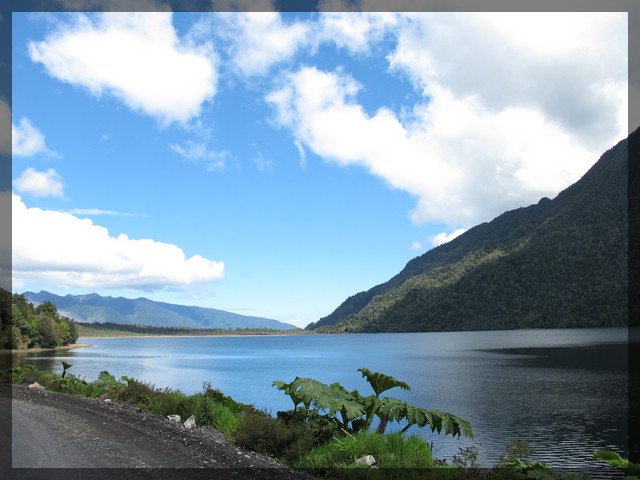 Blick vom Südufer des Lago Yelcho nach Norden.Wir hätten an der Kreuzung mit der Carretera Austral einen großen Wegweiser erwartet. Stattdessen gabelt sich die Straße einfach auf und die berühmte Carretera Austral unterscheidet sich auf den ersten Blick gesehen nicht sonderlich von der Straße, der wir von Futaleufu aus gefolgt sind. Allenfalls ist sie ein wenig breiter. Der Wald entlang der Straßenränder ist aber deutlich dichter und wilder. Auffällig sind die riesengroßen Rhabarberblätter, Pangue genannt, die hier in großen Mengen wachsen. Wir folgen der Straße zunächst nach Norden. Hier befindet sich eine längere Baustelle. Hier handelt es sich definitiv um eine größere Modernisierung, ob Asphalt mit ins Spiel kommt, können wir aber auch hier nicht erkennen. Die Straße führt fröhlich bergauf und bergab. Seitdem wir die Carretera Austral erreicht haben, hat sich das Wetter nicht wirklich verbessert. Die Straße ist feucht, was auf kürzliche stärkere Regenfälle hindeutet. Aktuell tröpfelt es, mal mehr, mal weniger.