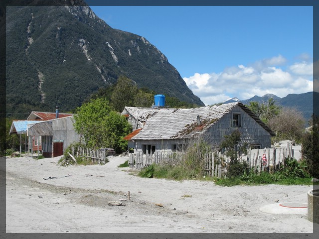 Der Ventisquero Yelcho und jede Menge Regenwolken.Weiter geht es Richtung Norden auf der Carretera Austral. Die Heizung und Klimaanlage unseres Pick Ups laufen auf voller Power, um unsere Klamotten zu entfeuchten. Nach wenigen Kilometern erreichen wir das Westufer des Lago Yelcho. Dort überqueren wir den Rio Yelcho über eine beeindruckende Hängebrücke. Einige Kilometer weiter nördlich erreichen wir den asphaltierten Teil der Straße. Vor einigen Jahren wurde ausgehend von der Ortschaft Chaiten begonnen, die Carretera Austral Richtung Süden zu asphaltieren. Diese Bemühungen kamen allerdings zu einem jähen vorläufigen Ende, als im Mai 2008 der nur etwa zehn Kilometer von Chaiten entferne Vulkan Chaiten ausbrach und weite Teile der Stadt durch Schlammlawinen zerstört wurden. Eigentlich hatte man den relativ kleinen Chaiten für inaktiv gehalten. Die Menschen in der Ortschaft hatten viel eher mit einem Ausbruch des deutlich weiter entfernten und größeren Vulkans Michinmahuida gerechnet. Aufgrund der exponierten Lage der Ortschaft und der Gefahr eines erneuten Ausbruchs wurde von Seiten der chilenischen Regierung entschieden, Chaiten in zehn Kilometer Entfernung, an der Stelle des Hafens Santa Barbara, wieder aufzubauen. Das Errichten von Gebäuden an der Stelle der alten Ortschaft wurde verboten. Zu unserer großen Überraschung gilt dieses Verbot aber scheinbar nicht mehr, sehen wir doch zahlreiche reparierte Gebäude, Geschäfte, Restaurants und sogar eine Filiale der staatlichen Tankstellenkette Copec. Weite Bereiche von Chaiten sehen aber noch genau so aus, wie direkt nach dem Vulkanausbruch 2008: Viele Häuser sind immer noch von hellgrauem Vulkanschlamm bedeckt. Auffällig ist auch, wie weit durch die abgelagerten Schlammmassen die Küstenlinie von der Ortschaft weg in Richtung Meer verschoben wurde.