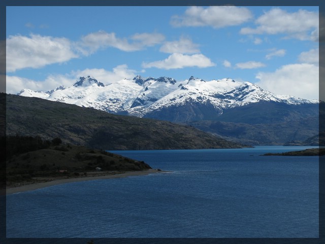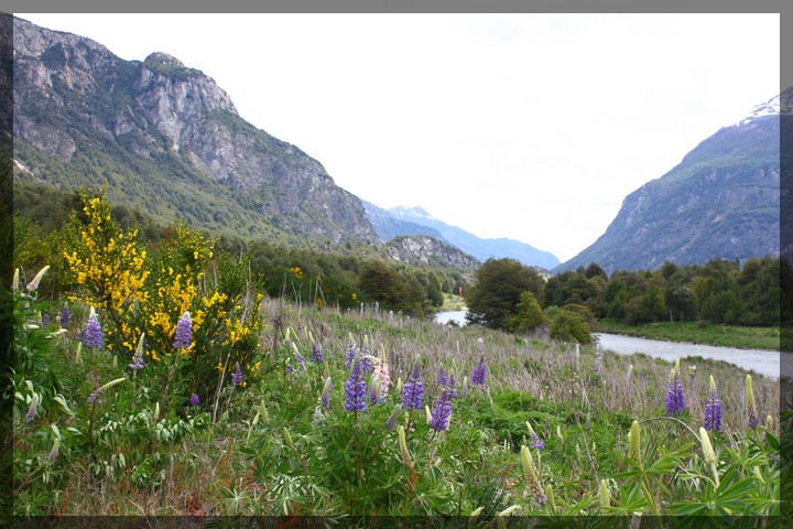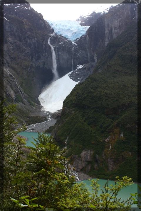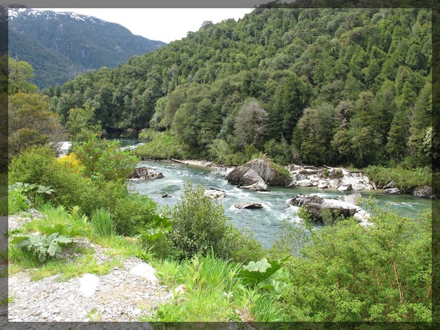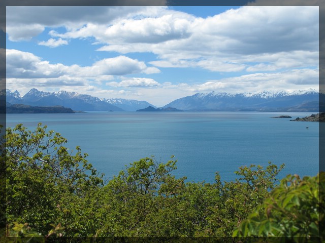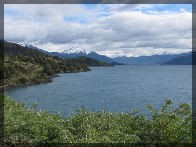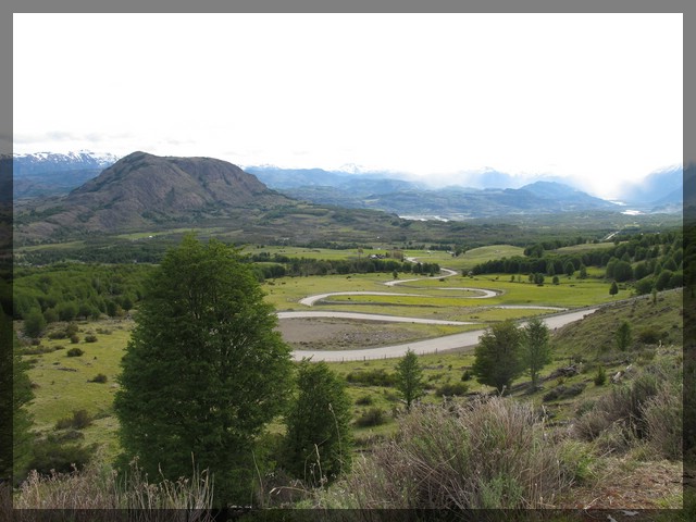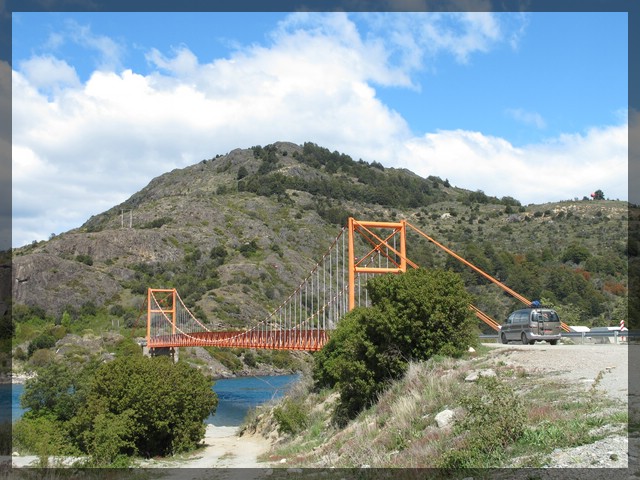 Blick auf den Lago General Carrera.Nur wenige Kilometer weiter kommen wir zum Ausfluss des Lago General Carrera. Das Wasser fließt mit viel Gewalt durch eine Engstelle in den Lago Bertrand. Die Straße verläuft hier über eine orangefarbige Hängebrücke, die verdächtig an diejenige erinnert, mit der der Rio Rosselot nördlich von La Junta überquert wird. Die Erbauer der Carretera Austral haben hier scheinbar mehrfach die identische Brücke bauen lassen oder in einem Katalog bestellt oder sonst was. Auch von hier aus bieten sich tolle Blicke auf den Monte San Valentin und seine Gletscher. Etwas weiter südlich befindet sich übrigens noch ein dritter See, der kleine Lago Negro. Wer in der Gegend an diesen drei wunderschönen Seen einen hochklassigen Urlaub verbringen will, dem sei die edle Hacienda Tres Lagos ans Herz gelegt, an der wir mehr oder weniger direkt vorbei kommen. Im Verlauf der Reiseplanung hatten wir uns überlegt, hier zu übernachten, aber zum einen hat diese Übernachtungsmöglichkeit nicht in die Etappenplanung gepasst und zum anderen waren uns 133 Dollar pro Person im Doppelzimmer (und das in der Nebensaison) dann doch geringfügig zu teuer.