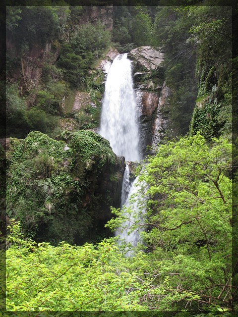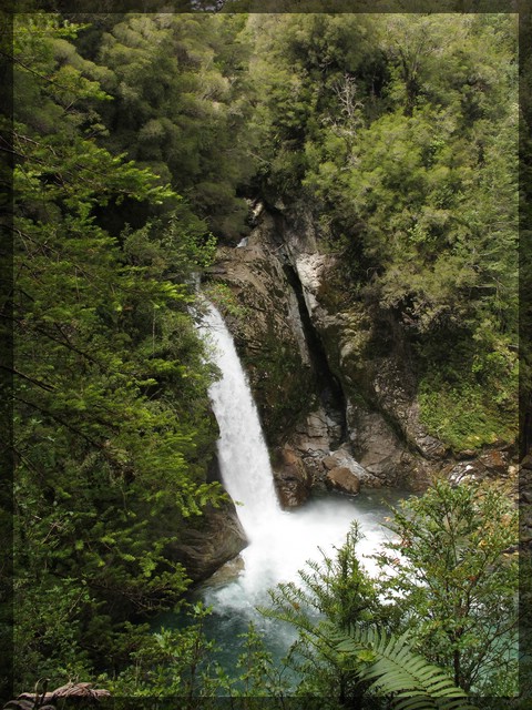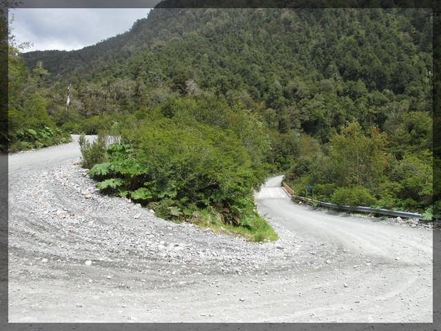 Hängebrücke am Ausfluss des Lago General Carrera.Kurz hinter der Hacienda Tres Lagos verlassen wir die Carretera Austral und biegen nach links, in Richtung Osten, ab auf die Ruta 265. Diese folgt zunächst einmal dem Südufer des Lago General Carrera, entfernt sich dann etwas von diesem und gewinnt steil an Höhe, nur um dann ebenso steil wieder bergab zu führen. Nach ein paar Kilometern erreichen wir die Ortschaft Puerto Guadal, wieder direkt am See gelegen. Im weiteren Straßenverlauf wird es sehr kurvig und es geht wieder gut in die Höhe. Kurz hinter Puerto Guadal müsste sich rechts der Straße die Cascada Maquis befinden, ein über mehrere Stufen herab fallender Wasserfall. Leider befindet sich dieser auf dem Grundstück einer Lodge und wir können von der Straße aus nur einen kurzen Blick erhaschen. Die Straße verläuft ein kurzes Stück im Landesinneren durch eine schöne grüne Landschaft. Der Straßenbelag verschlechtert sich zusehends, wir haben mit jeder Menge Löchern und Querrillen zu kämpfen, besonders im Verlauf der steilen Anstiege. Aber wir werden für die Mühen belohnt: Etwa 40 Kilometer hinter Puerto Guadal wird es spektakulär. Die Südseite des Sees grenzt hier direkt an eine steile Bergflanke. Die Straße ist hier quasi an den Berghang geklebt. Die Spannung wird dadurch erhöht, dass das Ganze teilweise ohne Leitplanke stattfindet. Links neben uns sehen wir, sehr weit unten, den See. Dessen türkisgrüne Farbe wird immer spektakulärer, je weiter wir nach Osten gelangen. Die Straße erreicht ihren höchsten Punkt am Paso de las Llaves, ab hier geht es bergab und nach einiger Zeit entfernen wir uns auch wieder ein wenig vom See. Eine wirklich tolle Straßenführung.