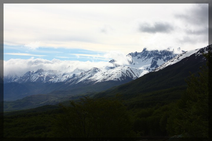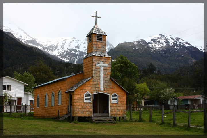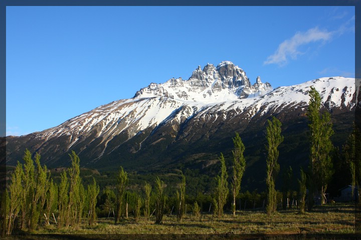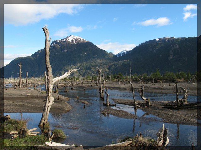 Der Cerro Castillo.In Villa Cerro Castillo endet der asphaltierte Abschnitt der Carretera Austral. Wir sind zu der frühen Stunde fast alleine unterwegs. Die Straße führt Richtung Westen zunächst durch dichten Wald steil bergauf, dann wird es eben. Auf der rechten Seite, ein gutes Stück unter uns, verläuft parallel zur Straße der Rio Ibanez, auf den sich tolle Blicke bieten. In der Folge verliert die Straße wieder an Höhe, bis wir uns ungefähr der Ebene des Flusses angenähert haben. Hier gibt es einen toten Wald, bestehend aus Bäumen, die die Ausbrüche des Vulkans Hudson 1971 und 1991 nicht überstanden haben. Die Baumüberreste stehen inmitten von Ablagerungen aus verschlammter Vulkanasche im hier sehr breiten Rio Ibanez. Bei dem Vulkan Hudson handelt es sich übrigens um eben jenen Vulkan Hudson, wegen dem vor einer Woche noch die Carretera Austral gesperrt war. Christl, die Besitzerin vom Club los Ulmos bei Pucon hat ja uns damals im Internet gezeigt, dass die Alarmstufe Rot ausgerufen war und ein schwerer Ausbruch kurz bevor stand. Wir hatten uns schon innerlich darauf eingestellt, unsere Reiseroute komplett umwerfen zu müssen. Allerdings konnten wir schon vor fünf Tagen, von Internetterminal des Hotels in El Bolson aus, feststellen, dass für den Hudson die Alarmstufe Rot aufgehoben wurde. Nachdem uns auch keiner der Leute, mit denen wir uns in den vergangenen Tagen entlang der Carretera Austral unterhalten haben, gewarnt hat und ganz offensichtlich auch die Straße nicht mehr gesperrt ist, scheint sich der Vulkan in der Tat wieder beruhigt zu haben.