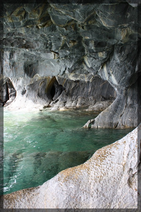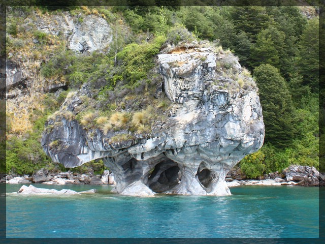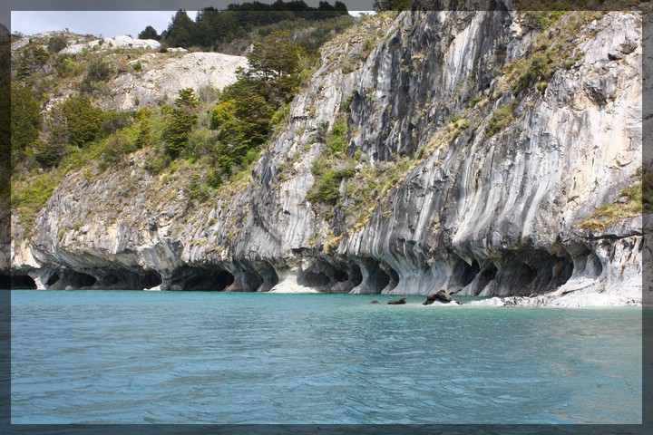 Blick auf den Lago General Carrera.Ziel unserer Bootsfahrt sind die Marmorhöhlen und die Marmorkathedrale. Diese entstanden, als das Wasser des Lago General Carrera die Marmorfelsen am Ufer angriff und auswusch und dabei im Laufe der Zeit tiefe Höhlen in das Gestein grub. Es weht eine steife Brise und das kleine Boot muss heftig arbeiten. Bei empfindlichen Naturen kann diese Fahrt bei derartigem Wetter durchaus mittelheftige Magenverrenkungen zur Folge haben. Nach etwa 15 Minuten Fahrt erreichen wir die Marmorhöhlen. Diese befinden sich in einer Felswand am Seeufer. Schon aus einiger Entfernung kann man die Auswaschungen gut erkennen, unser Fahrer steuert das Boot aber ganz nah heran und sogar in die Höhlen hinein. Ein phantastischer Anblick. Die vom Wasser erzeigten nahezu organischen Formen erinnern an Slotcanyons wie den Antelope Canyon im Südwesten der USA und irgendwie auch an die Wave, die große Sandsteinwelle an der Grenze von Utah und Arizona. Nur ist hier halt im Gegensatz zum für die USA typischen Rottönen alles in weiß und hellgrau gehalten. Wir dürfen auch aussteigen und ein wenig in den Höhlen herumlaufen.
