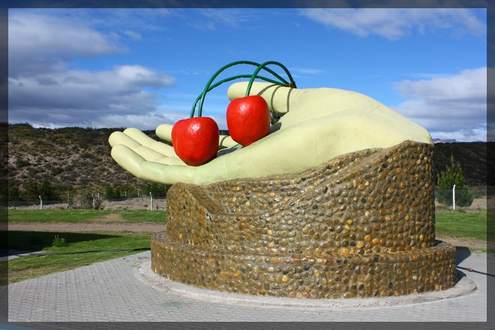 Los Antiguos ist ein adrettes kleines Städtchen. Waren auf chilenischer Seite die Gebäude hauptsächlich aus Holz gebaut, herrschen hier Steingebäude vor. Diese sind aber genau so schön bunt angemalt wie ihre Kollegen jenseits der Grenze. Wir suchen den örtlichen Bankautomaten und stocken unsere Vorräte an argentinischen Pesos etwas auf. Unser Auto freut sich auch, bekommt es doch ein paar Liter Diesel zum Trinken. Direkt am Ortsausgang von Los Antiguos kommen wir an einem interessanten Denkmal vorbei: Einer großen Hand, die zwei Kirschen hält. Kirschen in Patagonien? In der Tat, in dem Talbecken von Los Antiguos herrscht ein sehr mildes Mikroklima. Hier wachsen neben Kirschen auch Erdbeeren, Himbeeren, Brombeeren und Äpfel. Die Stadt gilt als Hauptstadt des argentinischen Kirschenanbaus. Vom Kirschdenkmal aus haben wir auch einen schönen Blick auf den Lago Buenos Aires, zum vorerst letzten Mal.