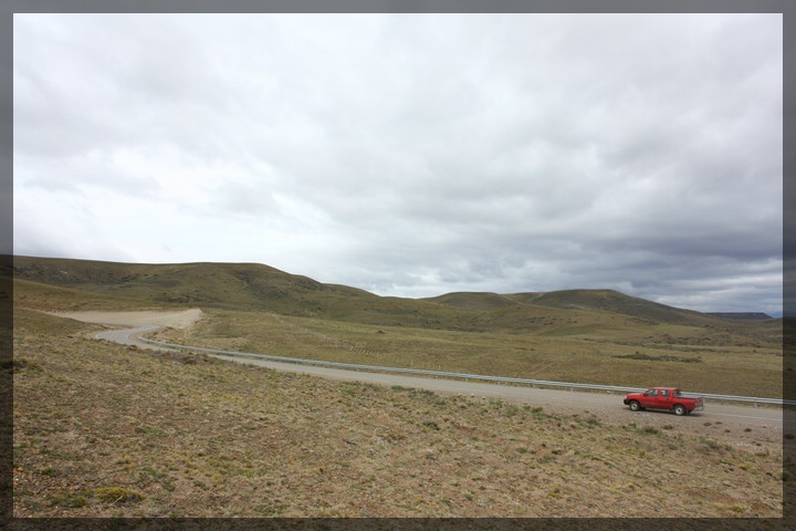 Was sich gestern schon angedeutet hat findet nun nämlich mit voller Gewalt statt: Der Wechsel des Landschaftstyps vom dichten Regenwald auf der chilenischen Seite der Anden zur kargen und trockenen Steppe in Argentinien. Kaum zu glauben, dass wir gestern noch an metergroßen Pangueblättern vorbei gefahren sind. Die Landschaft, durch die wir nun rollen ist zwar sehr trist aber gerade deswegen wunderschön. Es ist hügeliger als erwartet und immer mal wieder ergibt sich von einer Anhöhe doch noch ein kurzer Blick auf den Lago Buenos Aires. Kurz nach dem östlichen Ende des Sees kommen wir zur Ortschaft Perito Moreno. Die Häuser dieser Ortschaft gruppieren sich um eine große und wichtige Straßenkreuzung. Die allerwichtigste der hier zusammentreffenden Straßen ist natürlich die Ruta 40, jene legendäre Straße, die auf 5224 Kilometern Argentinien von Norden nach Süden komplett durchquert. Waren wir bisher weiter in Norden auf asphaltierten Abschnitten der Ruta 40 unterwegs gewesen, so steht nun der Ritt durch die patagonische Steppe auf dem Programm, über viel Gravel und keiner Tankstelle über viele hundert Kilometer. Unser Pick Up mit seinem Dieselmotor hat sich im bisherigen Verlauf der Reise als äußerst genügsam erwiesen. Nachdem wir in Perito Moreno direkt an einer großen Tankstelle vorbei kommen, nutzen wir diese Gelegenheit, um dennoch ein paar Tropfen nachzufüllen. Der Tankwart reagiert ob der kleinen Menge nachzufüllenden Sprit etwas verwundert, aber das soll uns egal sein.