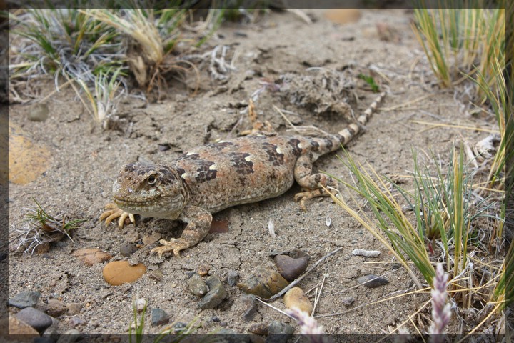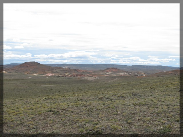 Zunächst ist die Ruta 40 noch asphaltiert und wir kommen gut voran. Wir sind nun wirklich in der Steppe angekommen. Die karge Landschaft entlang der Straße erinnert entfernt an Gegenden irgendwo in North oder South Dakota. Andererseits kommen auch andere Einflüsse mit ins Spiel: Nach einigen Kilometern sehen wir links in einiger Entfernung von der Straße interessant gefärbte Hügelstrukturen, eine Art Painted Desert, die sich so ähnlich auch irgendwo in Australien befinden könnte. Wir halten an und laufen ein wenig herum, um die Wüste und die gefärbten Dünen näher anzuschauen. Dabei stolpern wir fast über eine interessant geformte Echse, die uns neugierig anschaut. Wie wir später erfahren, handelt es sich dabei um einen Matuasto, eine hier in der Wüste heimische Echsenart.