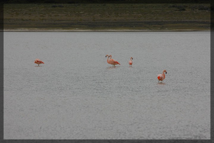 Wir lassen uns von Bruno eine genaue Wegbeschreibung geben und brechen auf. Die kleine Piste ist mit unserem Pick Up problemlos zu bewältigen. Hinter der Estancia geht es zunächst ein bisschen bergauf, bis wir die Hochebene erreichen. Hier kommen wir an diversen kleinen Salzseen vorbei, in denen wir jede Menge Flamingos sehen. Etwas später kommen wir an unseren ersten Guanacos vorbei. Diese wildlebende Kamelart mit ihrem schön rötlich-weiß gefärbten Fell ist typisch für Patagonien und ist die Urform des domestizierten Lamas. Da die Guanacos, denen wir heute begegnen, allesamt ein wenig schüchtern sind, bekommen wir ausreichend Gelegenheit, zunächst ihren typischen Blick zu studieren. Dieser lässt sich am ehesten mit einer Mischung aus neugierig und ein wenig doof beschreiben. In der Folge, wenn die Tiere nämlich vor uns Reißaus nehmen, sehen wir auch die interessante Art, mit der sich Guanacos fortbewegen. Die Schrittfolge ist irgendwie anders synchronisiert als bei den Tieren, die wir aus Europa gewohnt sind und in der Folge sieht das ganze recht staksig aus.