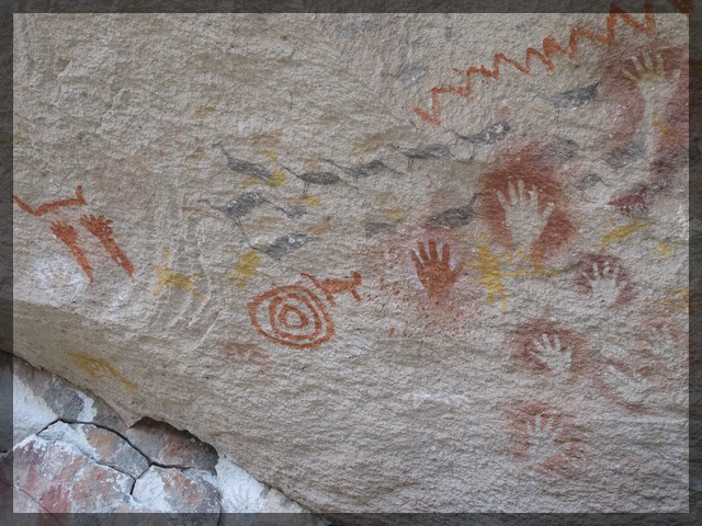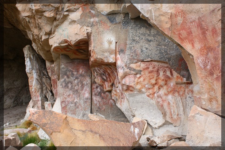 Die Handabdrücke sind erstaunlich gut erhalten. Hier wirkten die Alkoven als perfekter Schutz vor der Sonnenstrahlung und Wasser. Wie werden fast erschlagen von der Vielzahl an Händen in allen Größen und Farben. Wir sehen sogar eine Hand mit sechs Fingern. Wie schon bei Cerro Castillo gibt es positive und negative Handabdrücke. Im Vergleich zu den 3000 Jahre alten Malereien am Monumento Nacional Manos de Cerro Castillo decken die Handabdrücke hier einen viel größeren Zeitbereich ab: Die ältesten Hände sind 7000 Jahre alt, die neuesten Malereien dagegen gerade mal 1000 Jahre - dabei handelt es sich auch nicht mehr unbedingt um Hände: Natalia zeigt uns viele geometrische Muster und andere Formen. Es gibt auch einige Jagdmotive. Einige Spuren sind noch deutlich neuer als 1000 Jahre: Vandalen haben Steine mit Malereien aus der Wand gebrochen und an einer Stelle wurde mit Hilfe einer Sprühdose tatsächlich eine neuzeitliche Variante der negativen Handabdrücke angelegt.