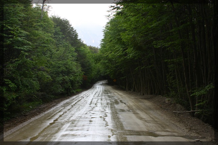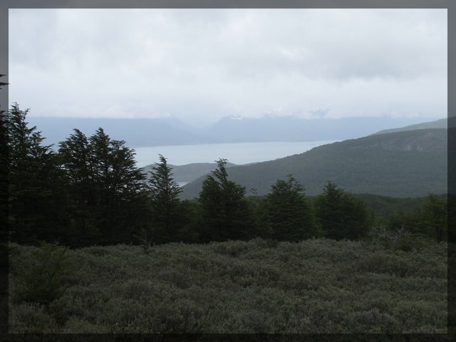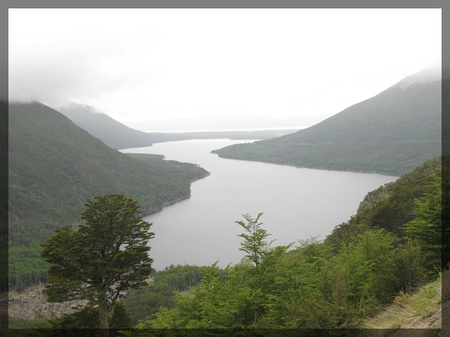 Nach dem Frühstück verabschieden wir uns von der Hosteria Kaiken und fahren weiter auf der Ruta 3 nach Westen. Die Straße verläuft durch dichten Wald parallel zum Südufer des Lago Fagnano. Ab und zu ergeben sich Blicke auf diesen langgezogenen See. Das Wetter ist nicht wirklich berauschend - der Himmel präsentiert sich grau in grau und es sieht nach Regen aus. Nach knapp 30 Kilometern biegt die Straße leicht nach Südwesten ab und entfernt sich dabei vom Lago Fagnano. Von hier an geht es stetig bergauf und am schönen kleinen Lago Escondido, eingezwängt zwischen im Westen, Süden und Osten stehenden hohen Bergen sieht es kurzzeitig so aus, als würde die Straße nicht mehr weiter führen. Hier beginnt die Straße sich an der östlichen und südlichen Seite des Tals in die Berge zu schrauben und dabei steil an Höhe zu gewinnen. Der Ausblick auf den immer tiefer unter uns zwischen den dicht grün bewachsenen Bergflanken gelegenen Lago Escondido ist grandios. Den höchsten Punkt der Straße stellt der Paso Garibaldi dar, den wir kurz darauf erreichen. Dieser 450 Meter hohe Pass ist die einzige Stelle, an der auf Feuerland eine Straße die hier in Ost-West-Richtung verlaufende Andenkette überquert. Wie schwierig es war, eine passende Stelle für diese Überquerung zu finden und dort eine Straße zu bauen, wird anhand der Tatsache deutlich, dass erst knapp 64 Jahre nach der Gründung der Stadt Ushuaia mit dem Bau der Straße über den Paso Garibaldi begonnen wurde. 1956 wurde der Bau abgeschlossen und erst seitdem ist vom südlichen Streifen von Feuerland aus der Rest der Insel einfach und schnell auf dem Landweg zu erreichen.
