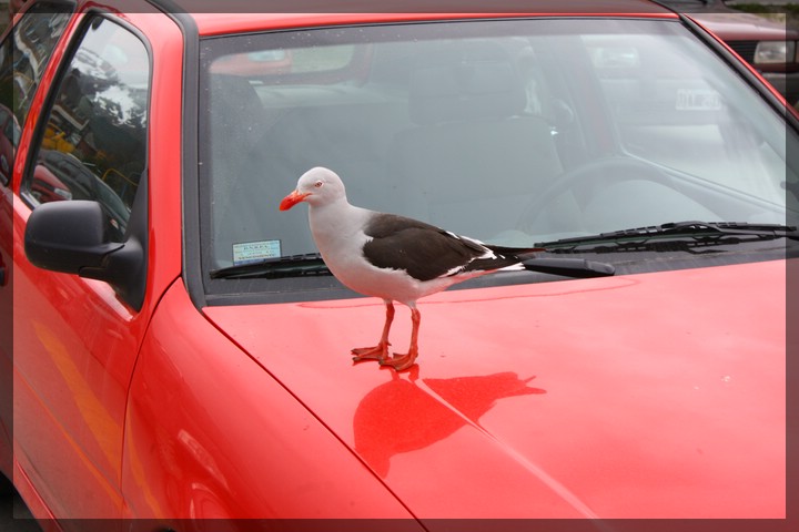 Möwe am Hafen in Ushuaia. Man beachte die sensible Abstimmung zwischen Farbe von Schnabel und Lack des Autos.