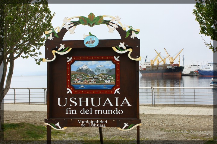Wir stellen unser Auto auf einem großen Parkplatz direkt an der Mole ab und schauen uns kurz am Hafen um. Hier gibt es ein schönes Holzschild mit einer historischen Darstellung des Hafens und der Beschriftung "Ushuaia - Fin del Mundo". Ja, jetzt sind wir in der Tat fast am Ende der Welt angekommen. Nachdem wir uns für einen der zahlreichen Anbieter entschieden und dort die Tickets für morgen erstanden haben, schauen wir noch nach einem Restaurant für unser Abendessen und fahren dann weiter.