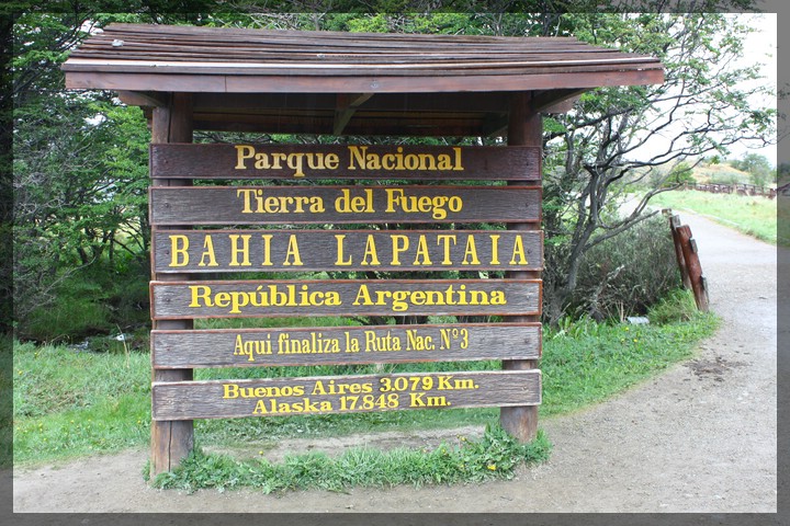 Wir fahren die durch den Park führende Straße bis an ihr Ende an der Bahia Lapatia. Und hier geht es nun endgültig nicht mehr weiter: Ein großes Holzschild informiert, dass dies hier das Ende der Ruta 3 ist, 3079 Kilometer von Buenos Aires und 17848 Kilometer von Alaska entfernt. Auch wenn wir nur einen kurzen Teil der Ruta 3 gefahren sind - auf der Carretera Austral und Ruta 40 war es sowieso viel interessanter als auf dieser fast durchgehend asphaltierten Straße entlang der argentinischen Atlantikküste - kommt in uns ein leicht wehmütiges Gefühl auf. Am Ende der Straße angekommen - so haben wir uns zuletzt 2007 gefühlt, als wir in Santa Monica am Ende der Route 66 standen.