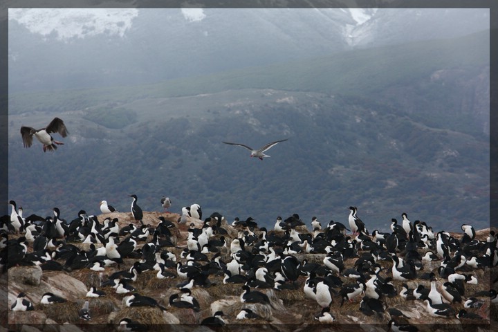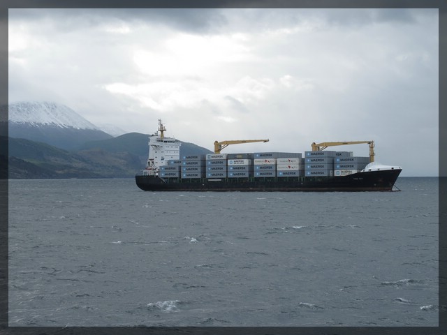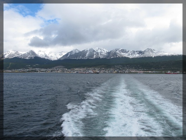 Das Wetter ist ganz gut. Zwar ist der Himmel recht dicht mit Wolken behangen aber immerhin regnet es nicht mehr. Der Blick zurück auf die Stadt mit ihrem Hafen und die dahinter aufgereihten Berge ist sehr schön. Die Berge sind bis recht weit unten mit einer dünnen Neuschneeschicht bedeckt. Gut, dass wir uns gestern gegen die Besteigung des Cerro Guanaco entschieden haben - wer weiß, welches Wetter uns dort oben im Laufe des Nachmittags erwartet hätte. Wir kommen an einem großen Schiff der norwegischen Hurtigruten vorbei und überlegen, wo dieses wohl als nächstes hinfährt. Am wahrscheinlichsten erscheint uns die Antarktis. Oder aber es steht die Rückreise nach Buenos Aires auf dem Programm.