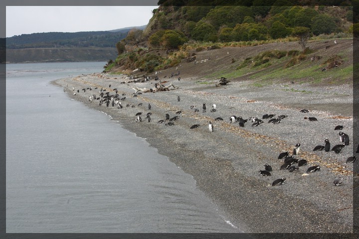 Bald darauf kommen wir an der Isla Gable vorbei, einer größeren Insel im Beaglekanal, die den Kanal bis auf eine Breite von etwas mehr als einen Kilometer einengt. Die Südküste dieser Insel zeigt interessante Gesteinsstrukturen, die irgendwie an den Badlands National Park in South Dakota erinnern. Hinter der Isla Gable, quasi in deren Windschatten liegt die kleine Isla Martillo, auf der sich eine größere Pinguinkolonie befindet. Hier zahlt sich der von uns schon zu Beginn der Fahrt festgestellte besonders flache Tiefgang unseres Schiffs aus: Der Kapitän steuert den Bug seines Gefährts mehr oder weniger auf den flachen Sandstrand der Insel. Von hier aus lassen sich die putzigen Pinguine aus einigen Metern Entfernung beobachten. Auf dem Strand befinden sich gar nicht mal wirklich viele Tiere - ein großer Teil wird zu dieser Tageszeit im Wasser unterwegs sein und Nahrung sammeln. Ein paar hundert Pinguine sind allerdings schon unterwegs. Es handelt sich größtenteils um Magellanpinguine mit den zwei weißen Streifen an der Brust.
