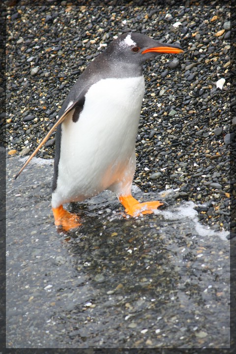 Zudem sehen wir einen einzelnen Eselspinguin herumwatscheln. Dieser sticht durch die Orangefärbung von Schnabel und Flossen natürlich extrem aus der Masse heraus. Eigentlich haben wir ja schon vor drei Tagen bei Seño Otway nördlich von Punta Arenas jede Menge Pinguine gesehen, aber dennoch ist der Besuch auf der Isla Martillo etwas ganz besonderes. Denn von der Aussichtsplattform am Bug des Schiffes können wir nicht nur beobachten, wie die Pinguine an Land herumwatscheln. Nein, wir können auch von oben aus verfolgen, wie sich die ins Wasser hüpfenden Tiere pfeilschnell durch das sehr flache und kristallklare Wasser bewegen und dabei teilweise sogar kleine Kunststückchen wie Sprünge zeigen. Vor allem die teilweise sehr akrobatische Technik, mit der sich die Pinguine mit viel Schwung aus dem Wasser an Land katapultieren ist sehr beeindruckend.