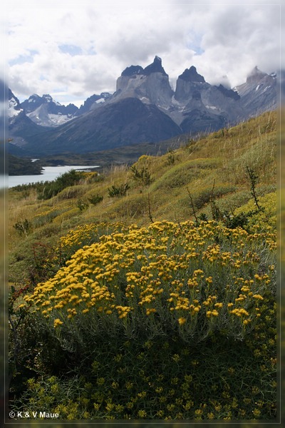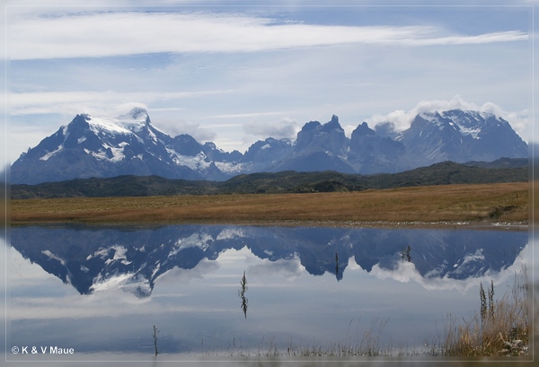Wie eine Felsenburg ragen die Gipfel des Torres del Paine aus der patagonischen Ebene auf. Der höchste Gipfel ist der Cerro Paine Grande mit 3050 m. Es war so windstill, dass sich die Berge in kleinen Seen spiegelten.