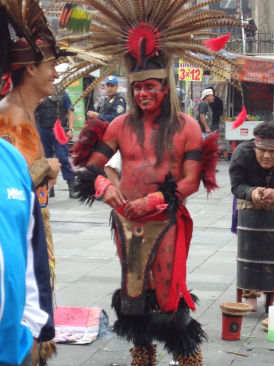 Am späten Nachmittag fahren wir zurück ins Zentrum. Am Zocalo lässt uns Enrique aus dem Fahrzeug. Er wird uns morgen um 8 Uhr zur Pyramiden-Tour abholen. Am Hauptplatz war viel los. Auf dem Weg zur Ausgrabung des Templo Mayor war ein Markt. Hier wurden alle möglichen Dinge angeboten. Die Geisterbeschwörungen von im Aztekenstil gekleideten Personen gefielen uns besonders gut, allerlei Geräuchere und mystisches beschwören.
