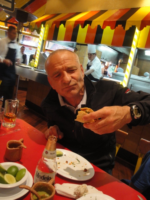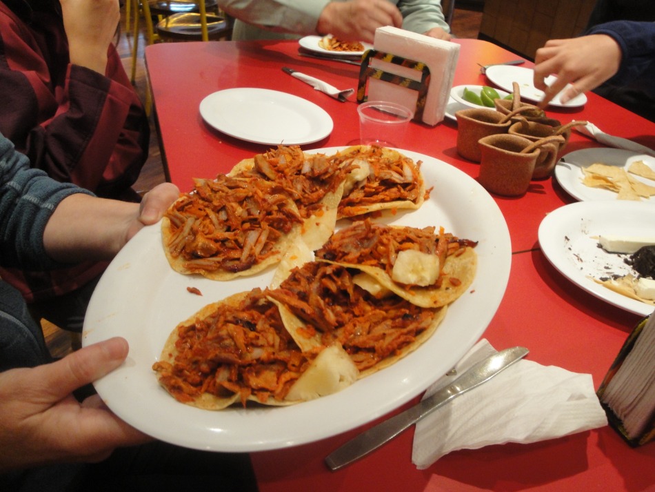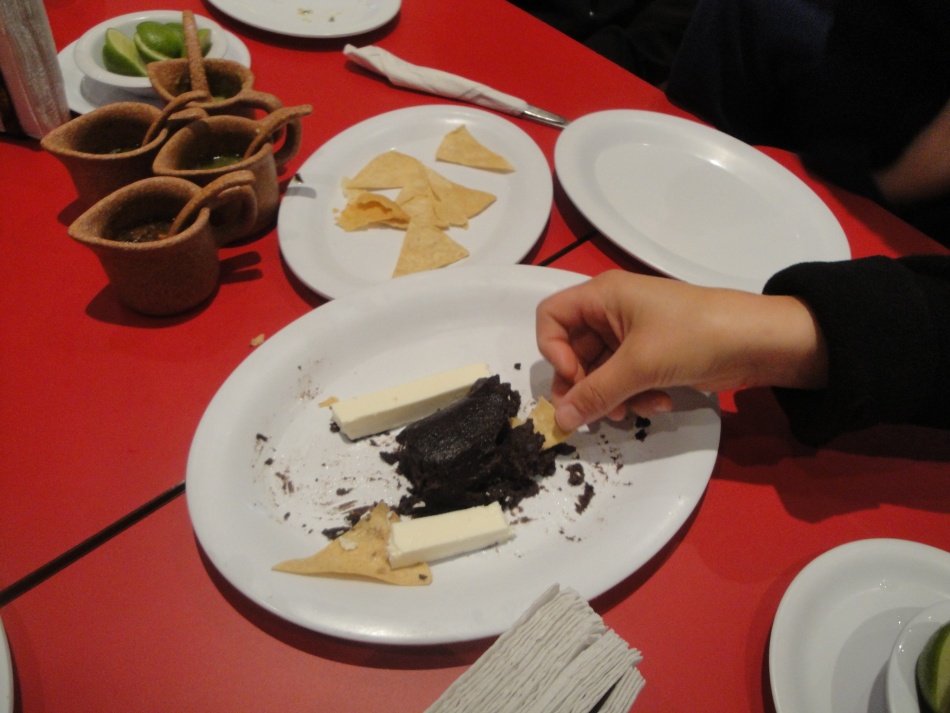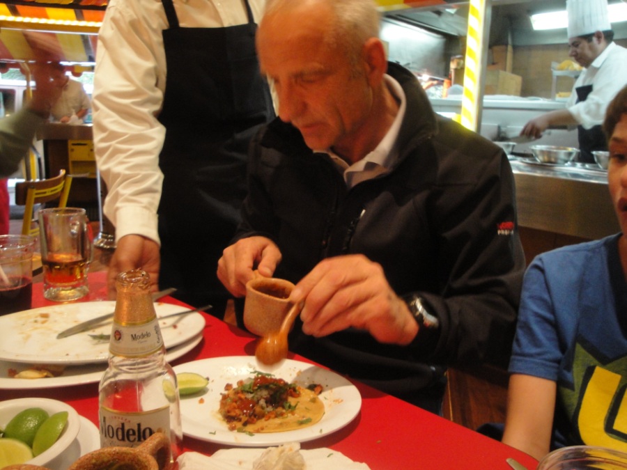 Nach diesem Bootsausflug fuhren wir zum angeblich (Zitat Enrique) besten Taco-Lokal in ganz Mexico. „He is my good friend“ , aha also doch nicht „best“. Bei der Fahrt ging ein Wolkenbruch nieder, der die Straßen in kleine Bäche verwandelte. Beim Lokal angekommen, wurden wir schon mit Schirm erwartet. Es war gleich zu sehen, dass Hygiene hier groß geschrieben wird. Es gab sogar eigene Waschbecken im Speisesaal für die Gäste. Für alle Speisen gilt, sie werden nicht scharf serviert. Erst durch die verschiedenen Chillisaucen bekommen sie die Schärfe. Als ersten Gang bekamen wir Bohnenmus. Mit den Taco-Blättchen wurde das Mus heruntergestochen und mit der gewünschten Sauce betupft.