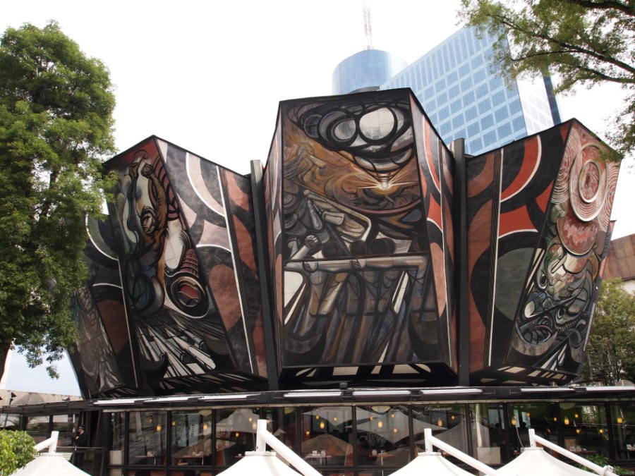Unser erstes Ziel ist das Polyforum Cultural Siqueiros. Das zwölfzackige Gebäude und die Umgebung sind mit Malereien und Skulpturen von verschiedenen Künstlern versehen, meist Revolutionäre.