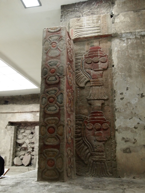 Zuerst machten wir einen kleinen Rundgang beim nördlichen Eingang dem Quetzalpapalotl-Palast. Enrique erklärte uns, wie wir erkennen können, was echt ist, und was rekonstruiert wurde. Alle Mauern und Treppen mit den kleinen Steinchen in den Fugen sind wiederhergestellt.