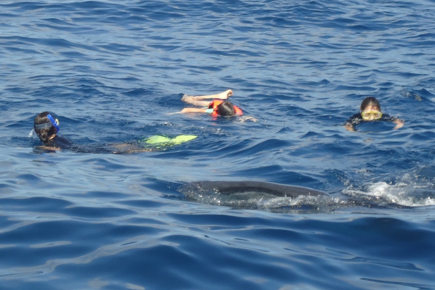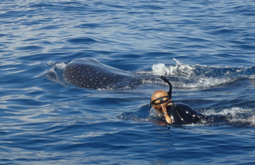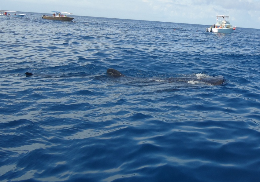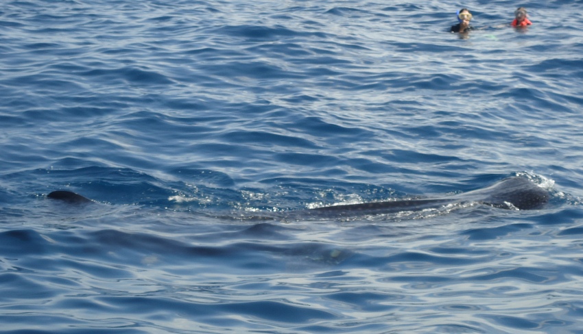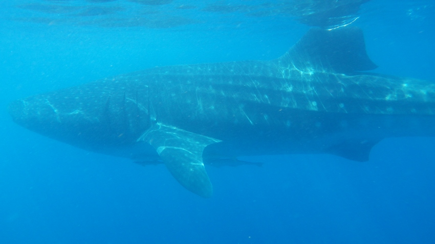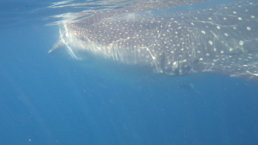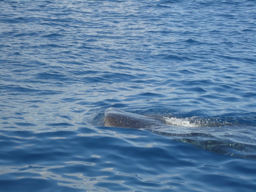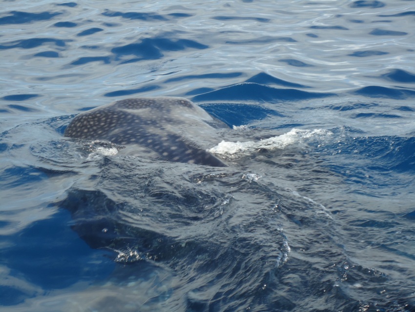 Flossen auf und runter vom Boot. Jonas verlor gleich mal eine seiner Flossen, unser Guide konnte sie noch herauftauchen. Die Franzosen waren ganz aus dem Häuschen  vor Glückseligkeit. Das Schiff schwankte, für mich als Landratte bedenklich. Erste Anzeichen der Seekrankheit machten sich bemerkbar. Ich war froh, als Florian und ich an der Reihe waren. Im Wasser schrie der Guide „Swim, swim“. Mit der Schwimmweste aber nicht so einfach. Glücklicherweise hatte ein Walhai erbarmen und kam uns entgegen, so konnten wir einige Blicke erhaschen. Auch das Schnorcheln ist mit einer Schwimmweste nicht einfach. Der Guide kümmerte sich aber gut um unseren Jüngsten, der mit gerade 9 Jahren kaum eine Chance hatte, mit den Tieren mitzuhalten. Er half ihm ganz nah an die Walhaie heranzuschwimmen – Jonas hätte nur den Arm ausstrecken brauchen um ihn zu berühren. Plötzlich schrie der Guide Manta, Manta und deutete nach unten. Ich tauchte ab und vor mir, in nächster Nähe, schwebte der Manta mit mächtigen Flügelschlägen vorbei. Ein wundervoller Anblick im sonnendurchfluteten Wasser. Als ich wieder auftauchte, deutete mir der Guide, dass wir wieder auf das Schiff sollten. Als nächstes waren Dietmar und Magdalena an der Reihe.