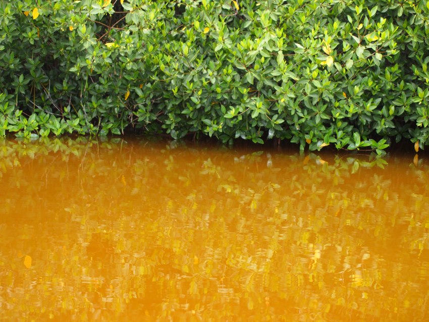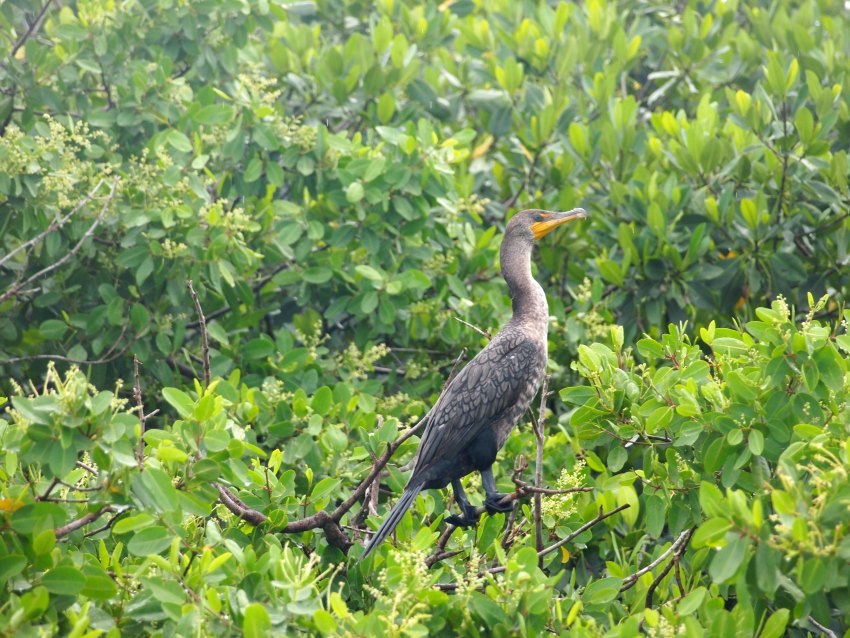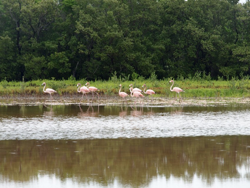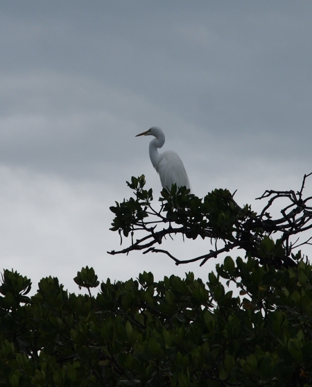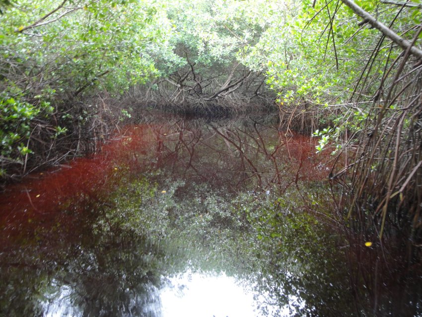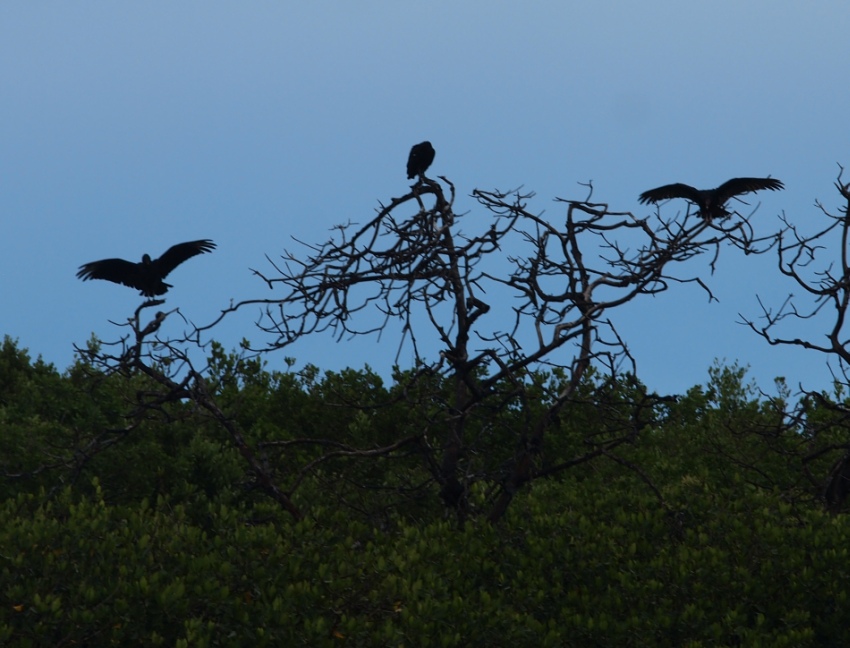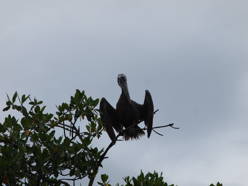 Sorgen machte uns eher der Regen, der immer stärker wurde. Als wir in Celestun ankamen, regnete es immer noch. Es war aber zu erkennen, dass er bald aufhören dürfte. Wir waren die ersten Besucher an diesem Tag. Ich ging zu den Kapitänen der Boote. Ein Mann sprach Englisch und vermittelte uns ein Boot. Als wir losfuhren, fielen die letzten Tropfen. Zuerst ging es nach Norden, wo normalerweise auch die Flamingos sind. Durch die Gewitter der letzten Tage sind sie aber zurzeit südlich der großen Brücke, die über die Lagune führt. Wir fuhren mit dem Boot den Mangrovenwald entlang.