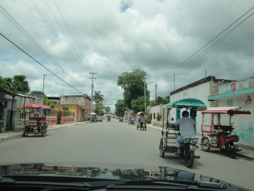 Die Fahrt nach Celestun ist unspektakulär. Links und rechts der Straße dichtes Gebüsch, das manchmal wie ein Tunnel über die Straße ragt. Erwähnenswert sind nur die vielen Geier, die um so mache Mülldeponie herum kreisten. In den Ortschaften waren wenige Autos zu sehen, dafür einige dieser Fahrräder.