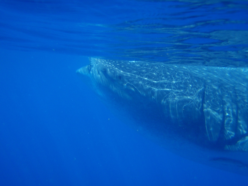 Auf dem Schiff schlug die Seekrankheit voll zu. Ich verfiel zusehends. Die anderen starteten schon mit der zweiten Runde. Ich wollte jetzt meine Ruhe und erst später vielleicht wieder ins Wasser. Die Aussicht war aber auch von Deck nicht schlecht. Die Fische schwammen direkt mit ihren großen Wasser einsaugenden Mäulern unter mir vorbei. Als auch die zweite Runde abgeschlossen war, konnte ich mich nicht mehr dazu aufraffen nochmals in Wasser zu gehen. So gingen Heike, Magdalena, unsere Begleiterin und der Guide ein drittes Mal ins Wasser. Innerlich verfluchte ich sie, ich wollte nur mehr, dass sich das Boot wieder bewegte. Das würde Linderung bringen. Sie nutzten die Zeit im Wasser und hatten das Glück besonders nahe an die Walhaie heranzukommen.