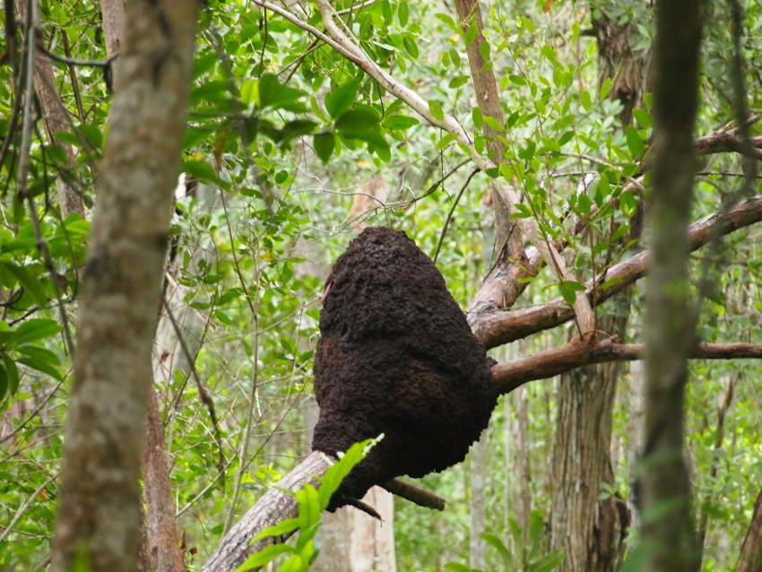 Dieser Steg führt zu einer starken Süßwasserquelle, in der man angeblich sogar baden kann. Wir konnten uns das alleine schon wegen der unzähligen Moskitos nicht vorstellen. Der Rundweg war sehr interessant, vor allem die schwarzen Tierbauwerke auf den Bäumen gefielen uns gut.