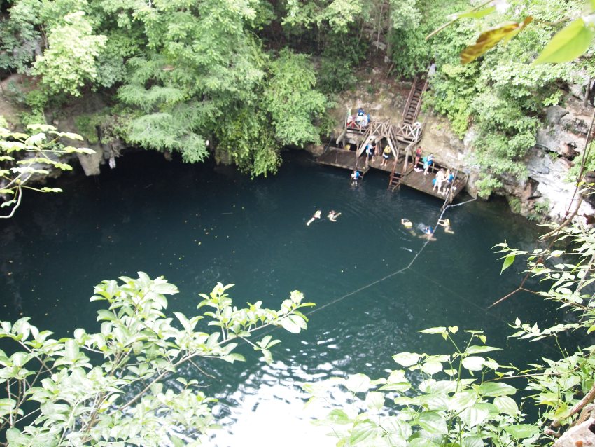 Es war nun früher Nachmittag und wir machten uns auf den Weg Richtung Merida. Bevor wir zu unserem Hotel nach Merida fuhren, besuchten wir noch den Cenote San Ignacio. Er liegt unscheinbar am Ortsrand von Chocola. Lustig war, dass hier im letzten Kaff, bei einer alten Frau der Eintritt mit Kreditkarte bezahlt werden konnte und das ohne Probleme. Wir sorgten hier gleich für allgemeines Gelächter als wir den Eingang suchten. Wir irrten am Gelände umher, der gleichzeitig ein Kleintierzoo war, bis alle restlichen Besucher lachend in eine Richtung zu deuten begannen. Der Eingang war gleich hinter der Hütte mit der alten Frau. Sie hatte den Eingang auch Dietmar gezeigt, der hatte aber nur freundlich genickt und nicht verstanden, was sie ihm sagen wollte. Er ist auch nur ein kleines Felsenloch mit einer steilen Betontreppe.