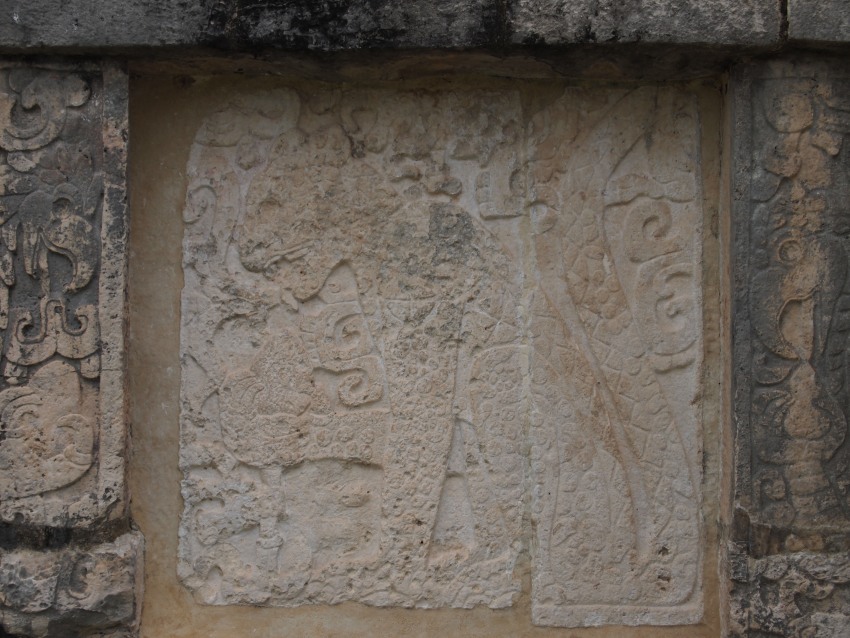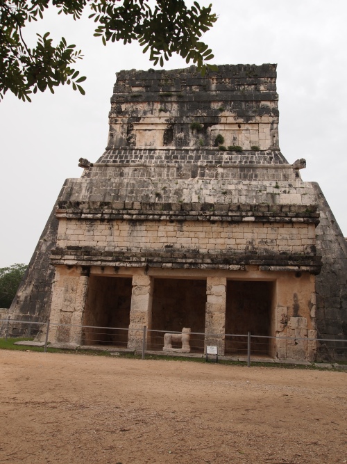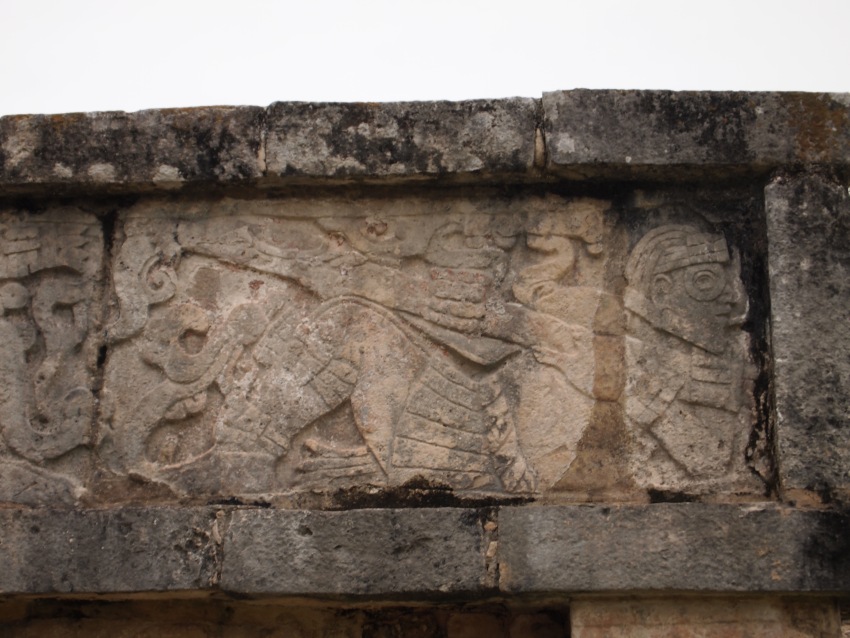 Links und rechts der Treppe sind zwei Schlangenköpfe und zwei Figuren. Die Figuren dienten als Fahnenhalter. Oben über der Treppe ist Chaak Mol (roter Jaguar) zu sehen. Er ist der Wächter der Heiligtümer und die berühmteste Skulptur Chichen Itzas.