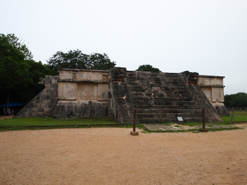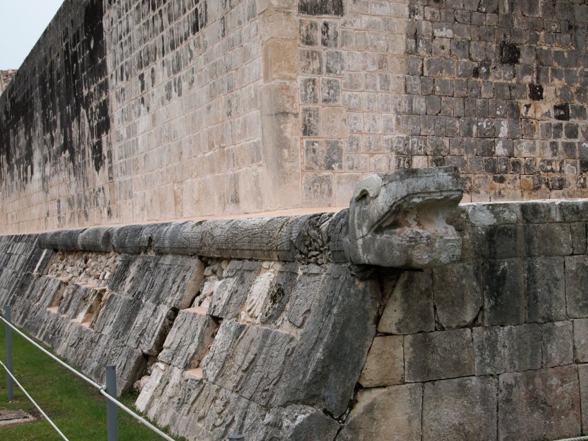 Bei diesem Ballspielplatz ist der Ring, durch den der Ball gebracht werden musste, erhalten. Darunter liegt eine Schlangenskulptur.