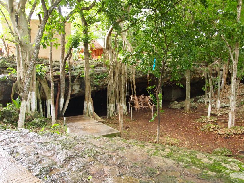 Wir machten uns auf den Weg zur Cenote Dzitnup. Auf dem Gelände befindet sich auch noch die Cenote Sak Mul Ha. Wir entschieden uns für Dzitnup. Für beide wäre uns auch der Eintritt zu teuer gewesen. Um zur Cenote zu gelangen muss man sich wieder durch Verkaufsstände schlagen. Ein unscheinbarer Ausgang führt zur Cenote. Der Eingang in die Unterwelt.