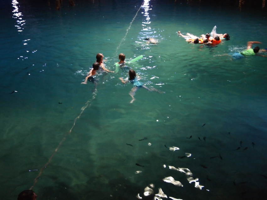 Unten waren einige Laute und es war schwül und warm. Dieser Cenote hat keine Deckenöffnung. Das Wasser war angenehm warm.