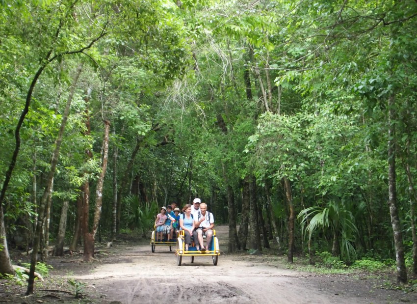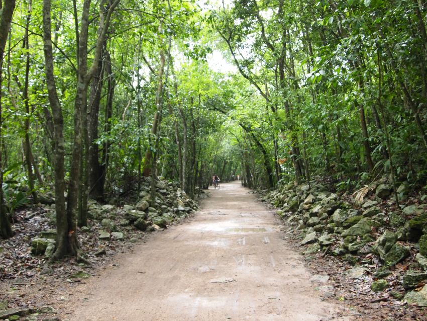 Gleich nach diesen Bauwerken gibt es einen Fahrradtaxistand. Die Anlage von Coba ist sehr weitläufig. Zwischen den verschiedenen Bereichen sind größere Wegstrecken zurück zulegen. Wir mieteten 3 Taxis für die gesamte Anlage. Zuerst wurden wir auf der Sakbe 9 zur Grupo Macanxoc gebracht. Allein die Fahrt durch den dichten Regenwald ist hier schon ein Erlebnis.