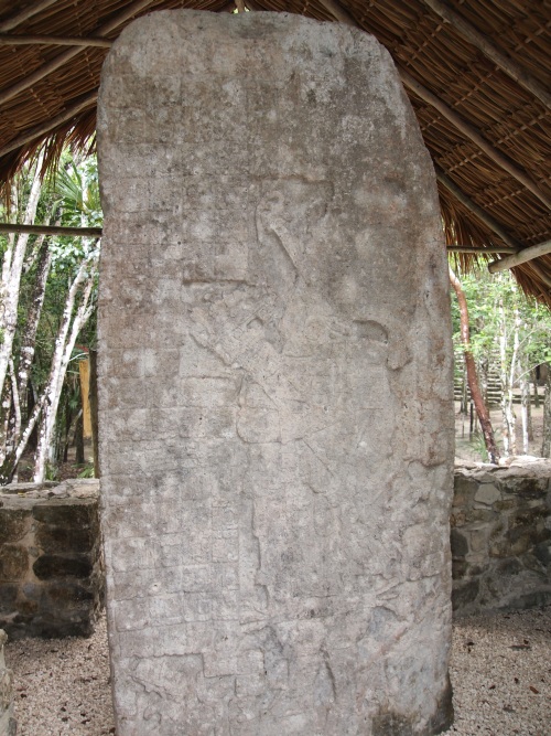 Bei dieser Grupo gibt es sehr viele Stelen und monolithische Altäre unter Palmendächern. Wir waren hier die meiste Zeit allein. Die Stelen wurden zur Erinnerung an Maya Herrscher errichtet. Die Stele Estela 1, ist eine herausragende. Sie ist mit 313 Glyphen und 4 wichtigen Datumsangaben versehen.