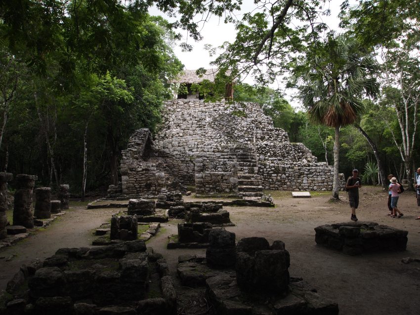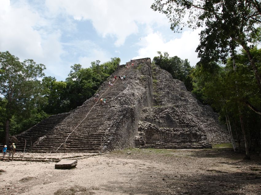 Nachdem Eingang wurde gleich die Grupo Coba erreicht. Zentrales Bauwerk ist die 25 Meter hohe Pyramide La Iglesia.