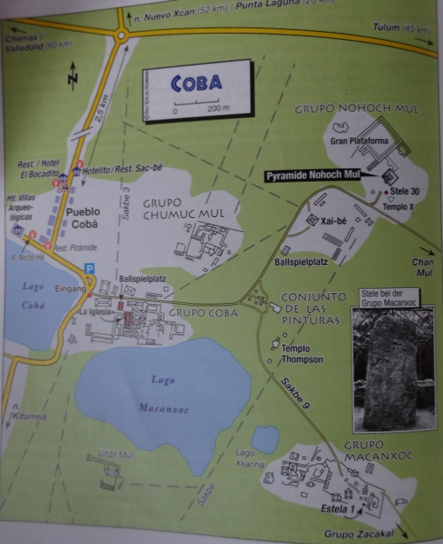 Wir waren wieder früh auf und schon um 9 Uhr in Coba. Am Parkplatz fuhren wir zunächst vorbei, da er so unscheinbar und leer war. Wir waren nicht mehr im Bundesstaat Yukatan, daher brauchte nur mehr der normale Eintritt bezahlt werden. Das Wetter war heute sonnig und zunehmend heiß.