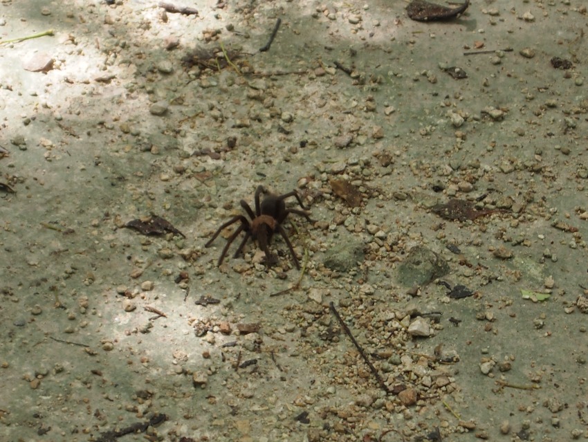 Auf dem Rückweg zur zentralen Kreuzung schrie Florian plötzlich laut: „Vogelspinne, Stopp!!!“ Wir wären dahinter fast über das Tier gefahren. Tatsächlich saß mitten auf dem Weg eine Tarantel. Unser Fahrer meinte nur: „Ach, die ist noch klein“.