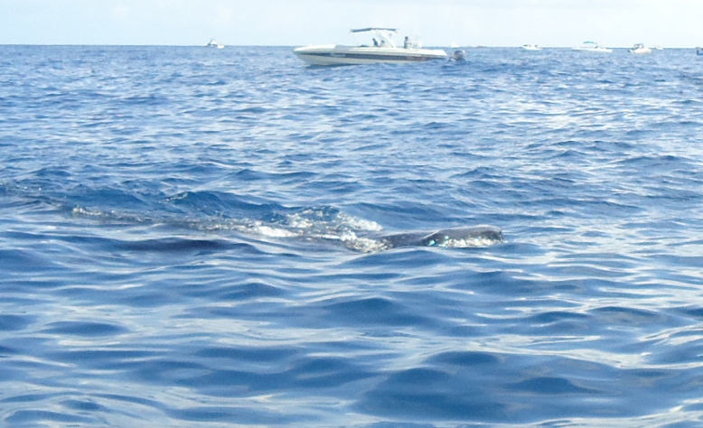 Mit einigen anderen Hochgeschwindigkeitsbooten fuhren wir an der Insel Mujeres vorbei, in nördlicher Richtung auf das Meer hinaus. Eine Wasserschildkröte kreuzte unseren Weg. Nach etwa einer Stunde sahen wir am Horizont eine Ansammlung von Booten. Wir hielten genau darauf zu und bald waren die ersten Schwanzflossen der Walhaie zu sehen. Wir stoppten in einem Rudel der größten Fische auf dieser Welt.